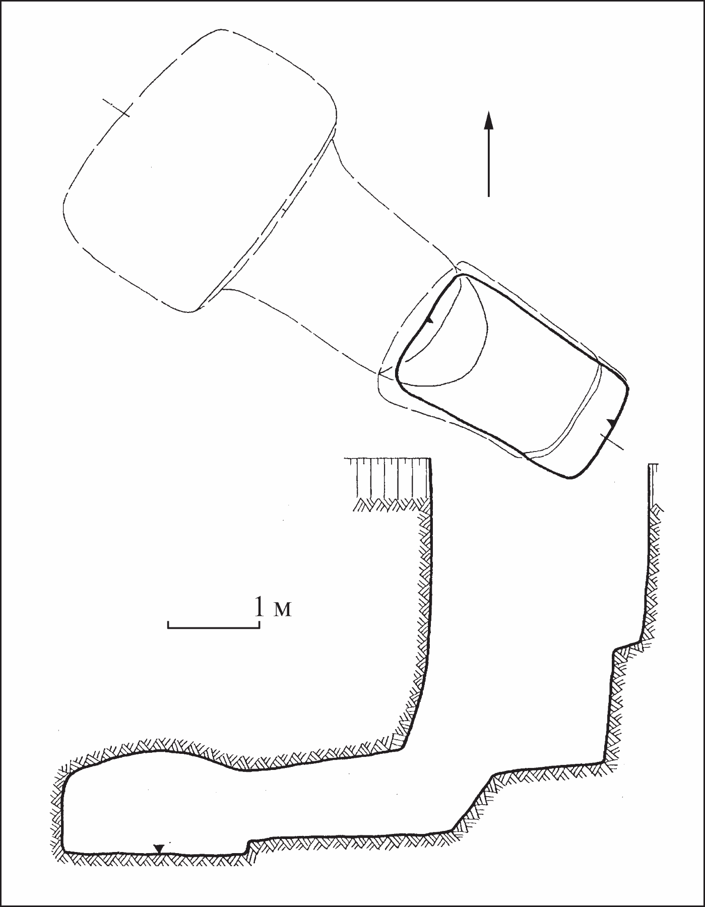 Трапециевидная в плане камера, 2,6-2,8×2,0 м расширялась к западной стене. Высота 1,2 м, глубина 6,0 м. Потолок и стены тщательно заглаженные и вымазанные. Покойник лежал на прямоугольном настиле 2,0×0,9 м из досок шириной 0,1 м – вытянутая головой на запад. По черепу лежали кости коровы с ножом (4), у левого виска – золотая серьга (5), на шее – гривна (6), вдоль правой руки – набор стрел (7). На среднем пальце левой руки была кольцо (8). Вдоль настила справа от скелета лежал дротик (9), а у входа стоял бронзовый котел (10).