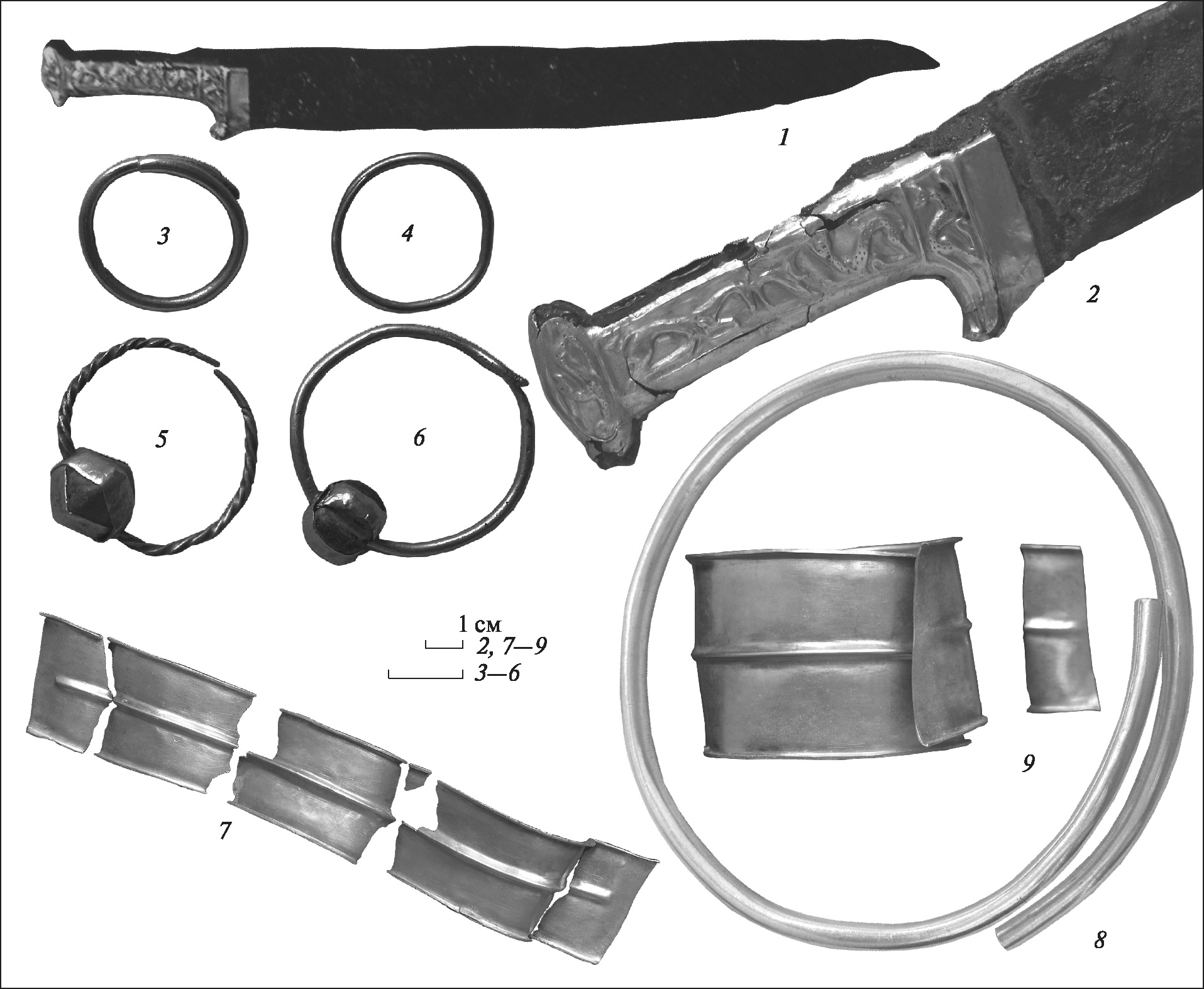 10. Однолезвиный железный меч имеет несколько вогнутый клинок и рукоять с овальным набалдашником и загнутым когтеобразным перекрестьем, которые были обтянуты тонкой, местами поврежденной, золотой пластиной 750-й пробы с рельефным изображением животных с обеих сторон. Длина рукоятки 13,8 см, клинка, в ходе реставрации несколько изменил свои первоначальные очертания, – 44,0 см, ширина 5,0 см (рис. 7, 1, 8, 2, 16, 1, 2).