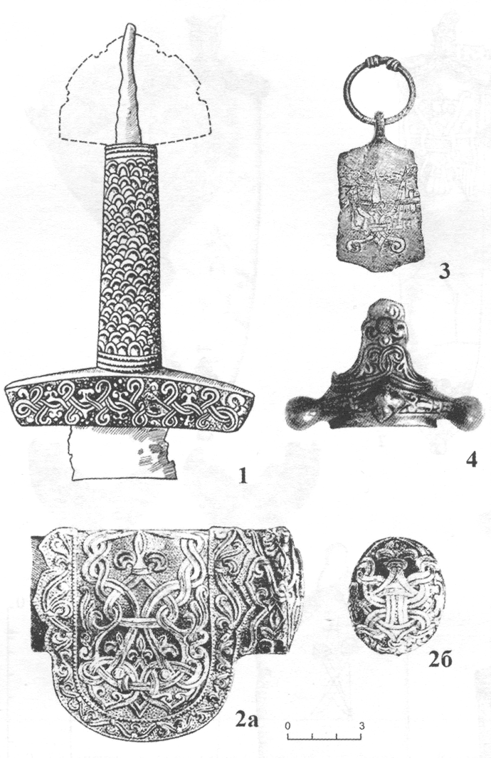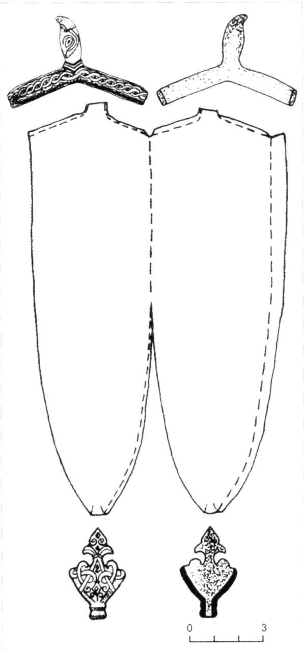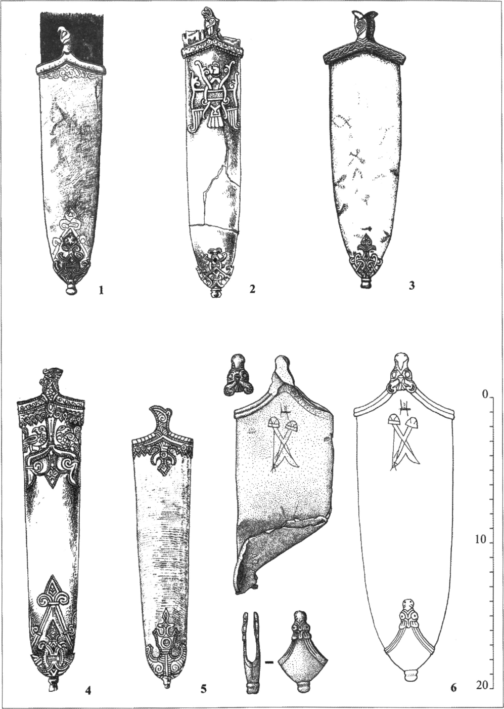 Находки моделей для изготовления деталей высоких наконечников ножен, предполагающие и производство самих наконечников в Великом Новгороде (и где то на территории Брянской области), не отрицают возможности изготовления подобных наконечников в Среднем Поднепровье. Очевидно, что производственных центров могло было несколько и правильнее говорить не о среднеднепровском центре, а о древнерусском производстве подобных наконечников25. Выработка определенных стилейых решений возможно и происходила в столице древнерусского государства, но мобильность дружин руссов приводила к распространению «модных» элитарных вещей и спросу на них на всей территории Древней Руси.