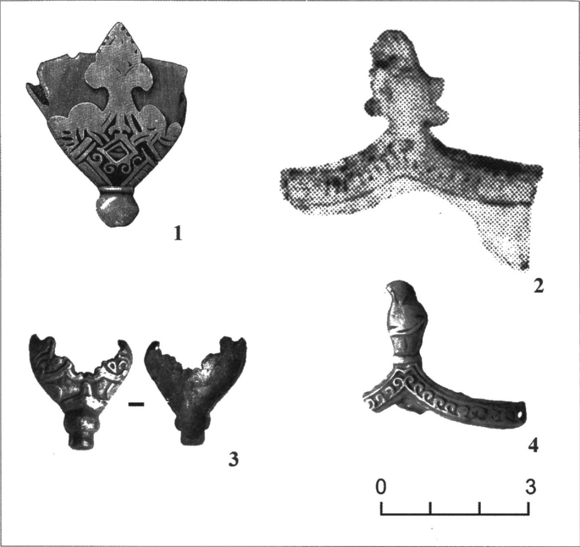 9) Украина. При несанкционированных работах с помощью металлодетектора в 2000-х гг. был найден фрагмент верхней части наконечника, состоящий из обломка накладного бортика, заканчивающегося головой птицы, и кусочка верхней части корпуса (рис. 2:4).