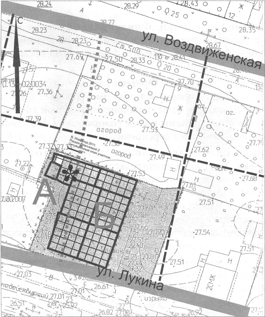 В течение нескольких лет в X веке на территории, вскрытой Власьевским-2 раскопом, было пахотное поле. Следы борозд в материке и пахотный слой прослежены на всей исследованной территории. В нем обнаружены раннекруговая керамика, стеклянные бусы, поясные бляшки. В конце X - начале XI в. произошло деление изучаемой территории плетнём на участки, на которых располагались постройки с печами-каменками. В XI веке территория делится на участки под усадьбы. Усадьба «А» имела площадь около 800 кв.м. Интересующая нас находка обнаружена в заполнении ямы начала - первой половины XI в., расположенной у западной границы усадьбы А (рис. 5).