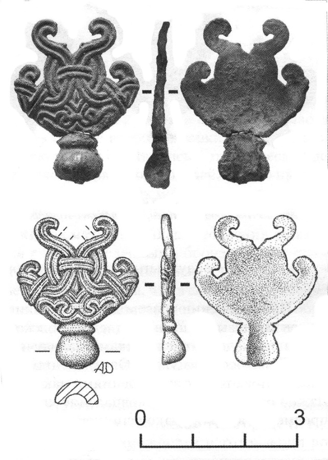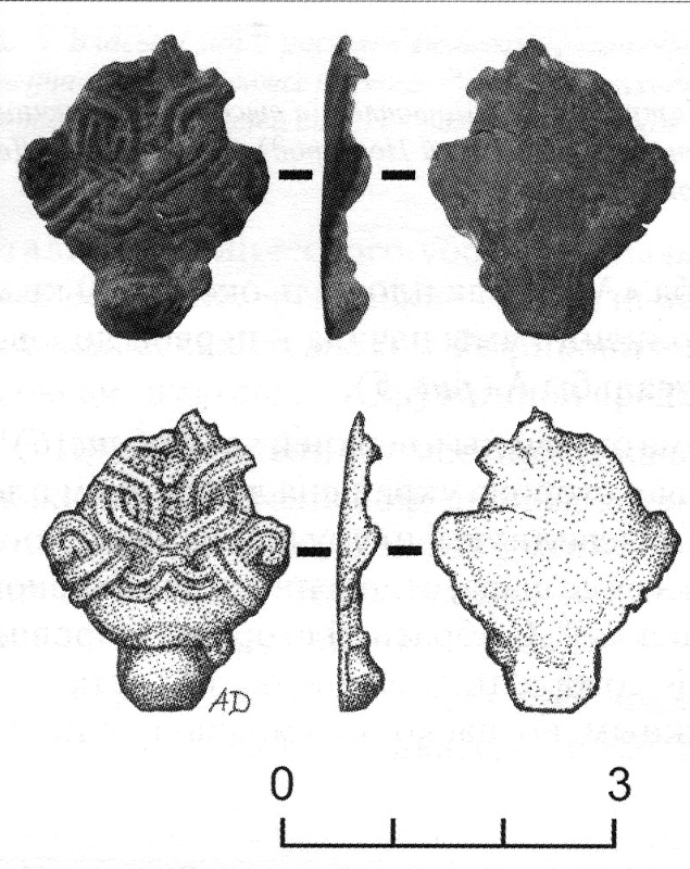 Предмет сохранился не целиком – два слома отмечены в верхней части (рис. 6)19. Высота предмета – 32 мм, ширина 23 мм. Лицевая сторона украшена ленточным плетением, в центральной части образующим миндалевидную фигуру (сохранившуюся частично). Нижняя часть предмета оформлена в виде шара, отделенного от основной части валиком. Тыльная сторона предмета плоская20. С обратной стороны шаровидного утолщения – продольное углубление21. К сожалению, исследовать состав металла этого предмета не представилось возможным, но, насколько можно предположить на основе визуальных наблюдений, он изготовлен из свинцово-оловянистого сплава.