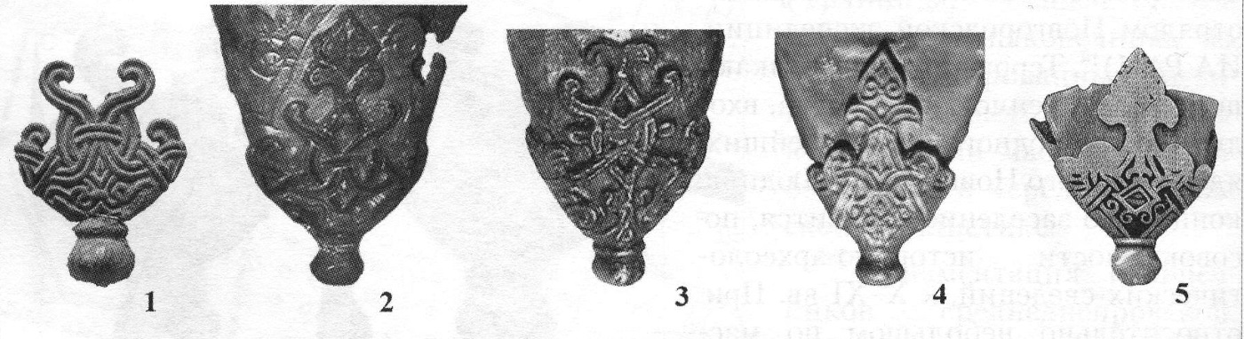 Орнаментация наконечников среднеднепровской группы, по мнению В. Н. Зоценко, полностью соответствует продукции, выделенной P. С. Орловым школы «Б» художественной металлообработки последней четверти X-XI вв.16 Характерными чертами этой школы являются плетение, завершающееся трехлепестковым цветком, миндалевидная сердцевина, расположенная в центре плетения, перехваты у основания трехлистника, боковые побеги, заканчивающиеся завитками и т.д. Помимо киевского наконечника в подобной орнаментальной традиции выполнены перекрестия сабель из Гочева и Княжой могилы, детали металлического убора так называемой сабли Карла Великого, перекрестие меча из Киева, княжеские знаки, исполненные в «парадном варианте», на некоторых подвесках со знаком Рюриковичей17 (рис. 4). Набор предметов демонстрирует их очевидную связь с дружинной средой.