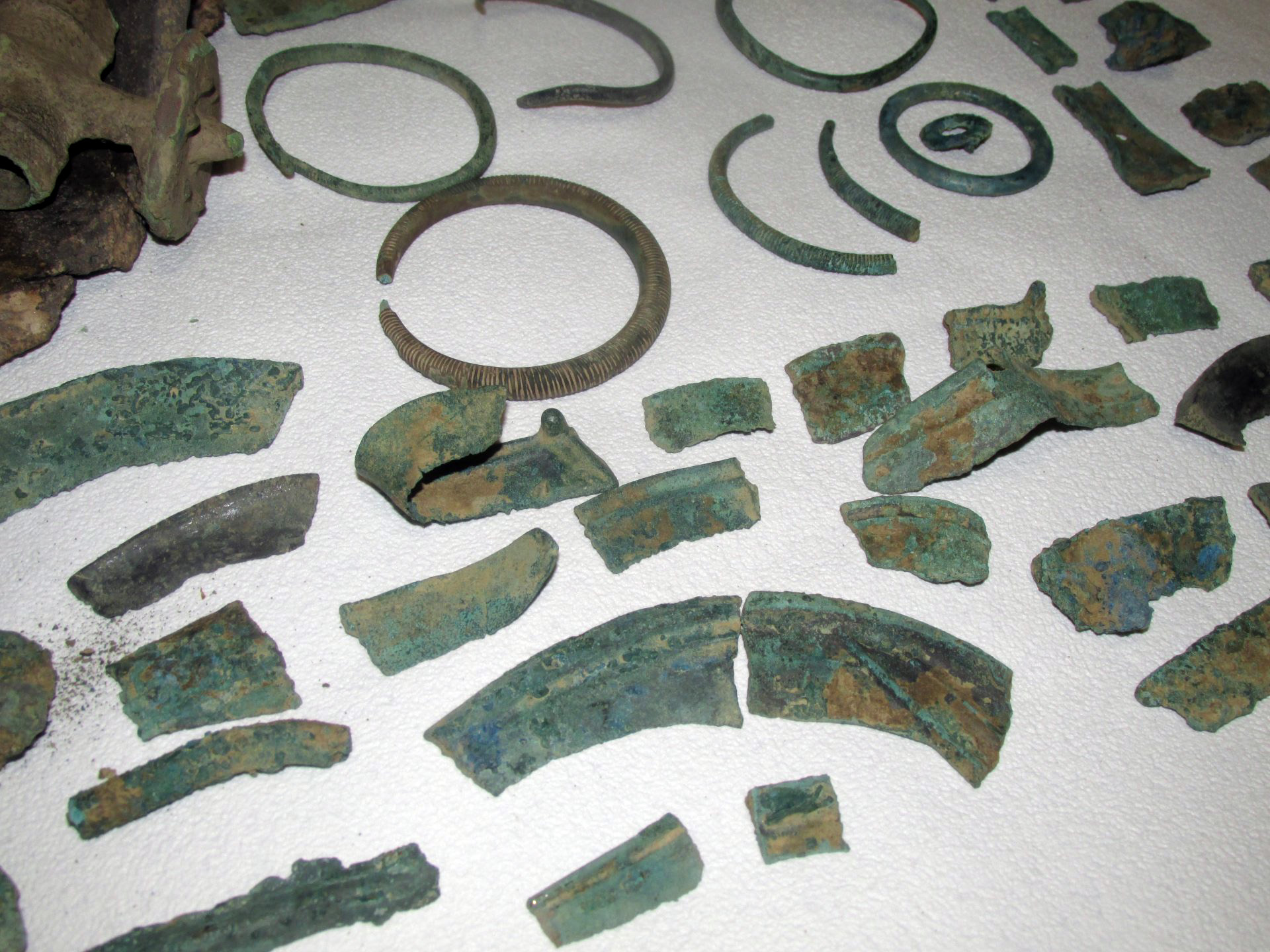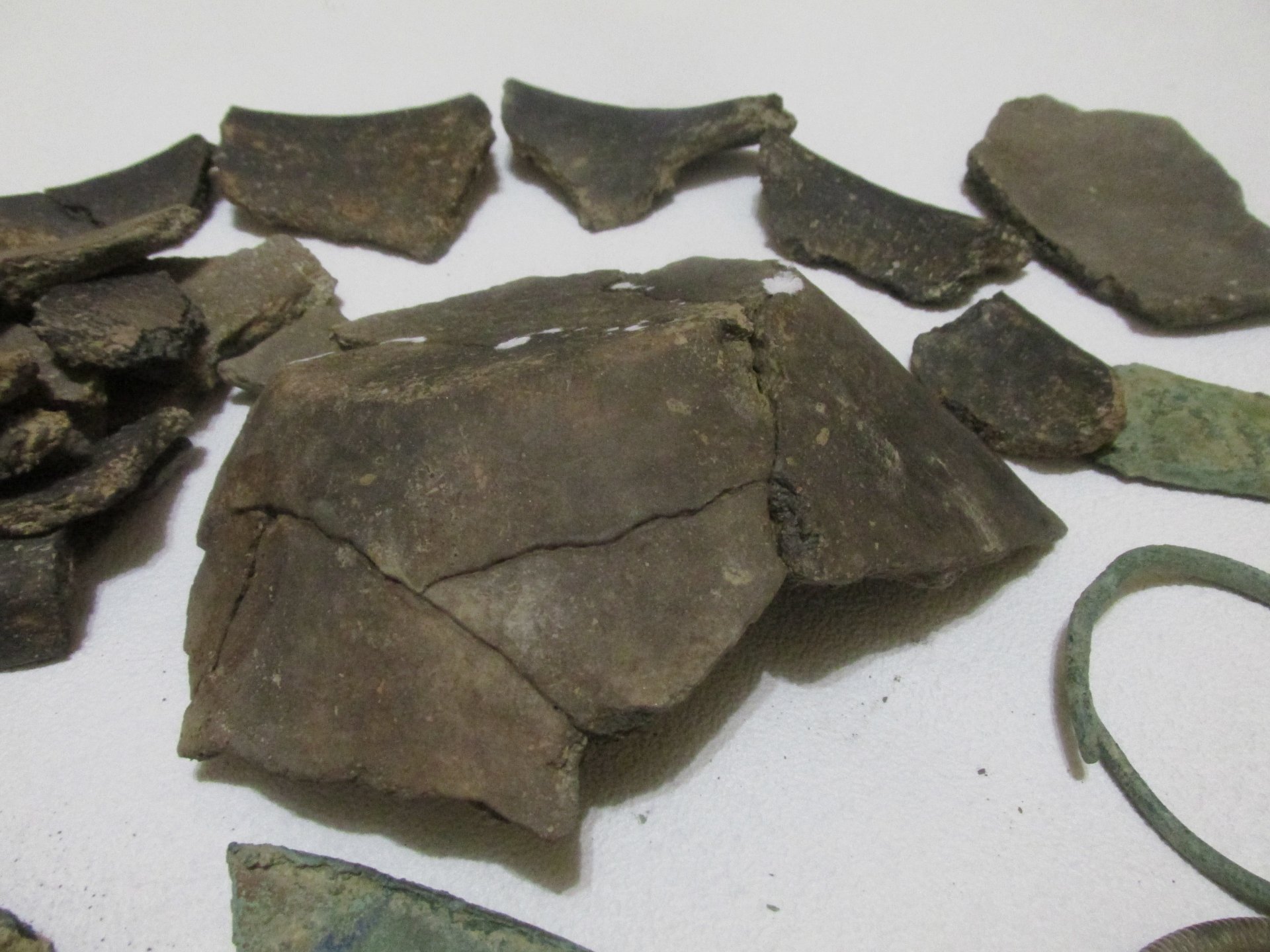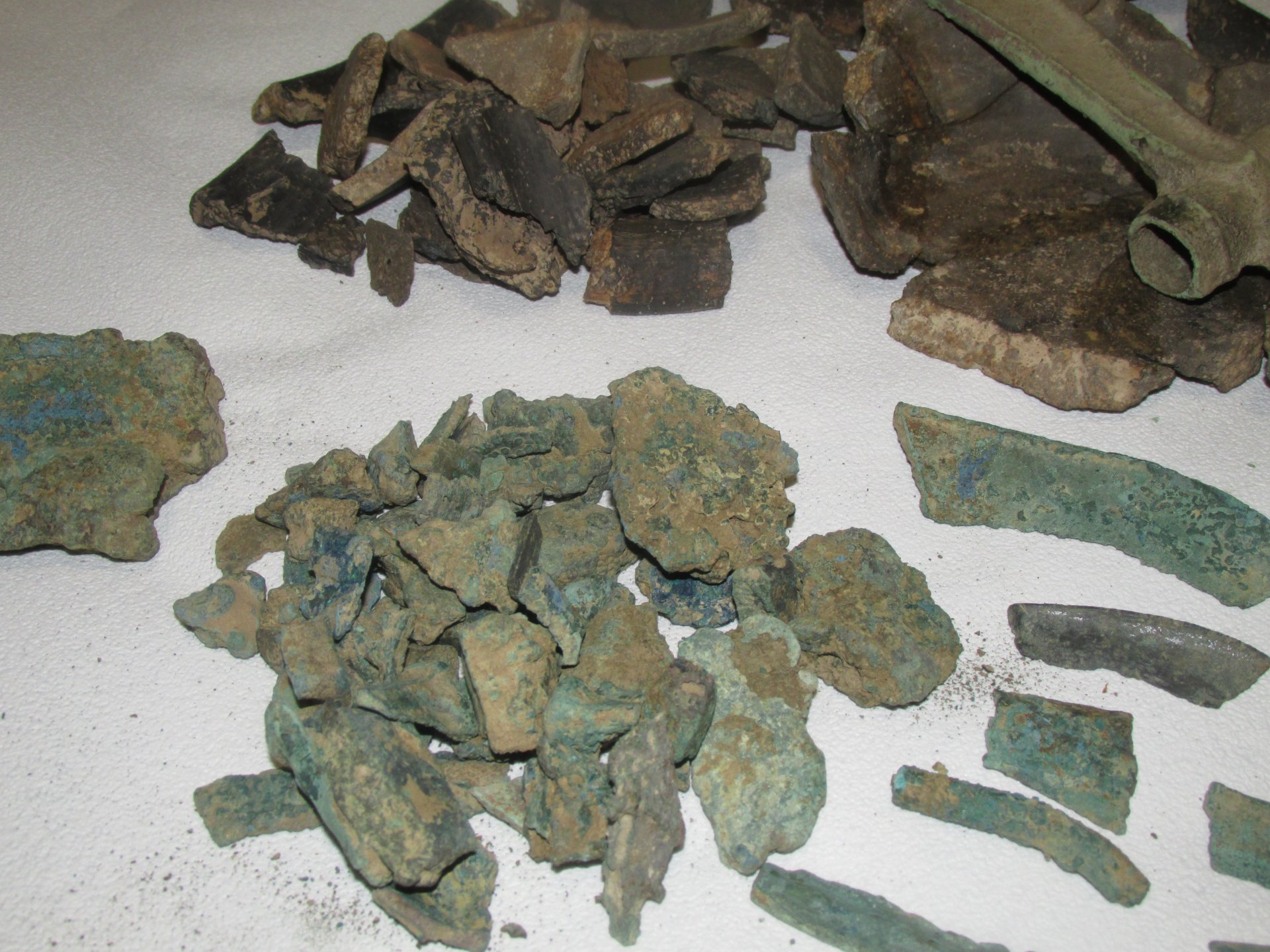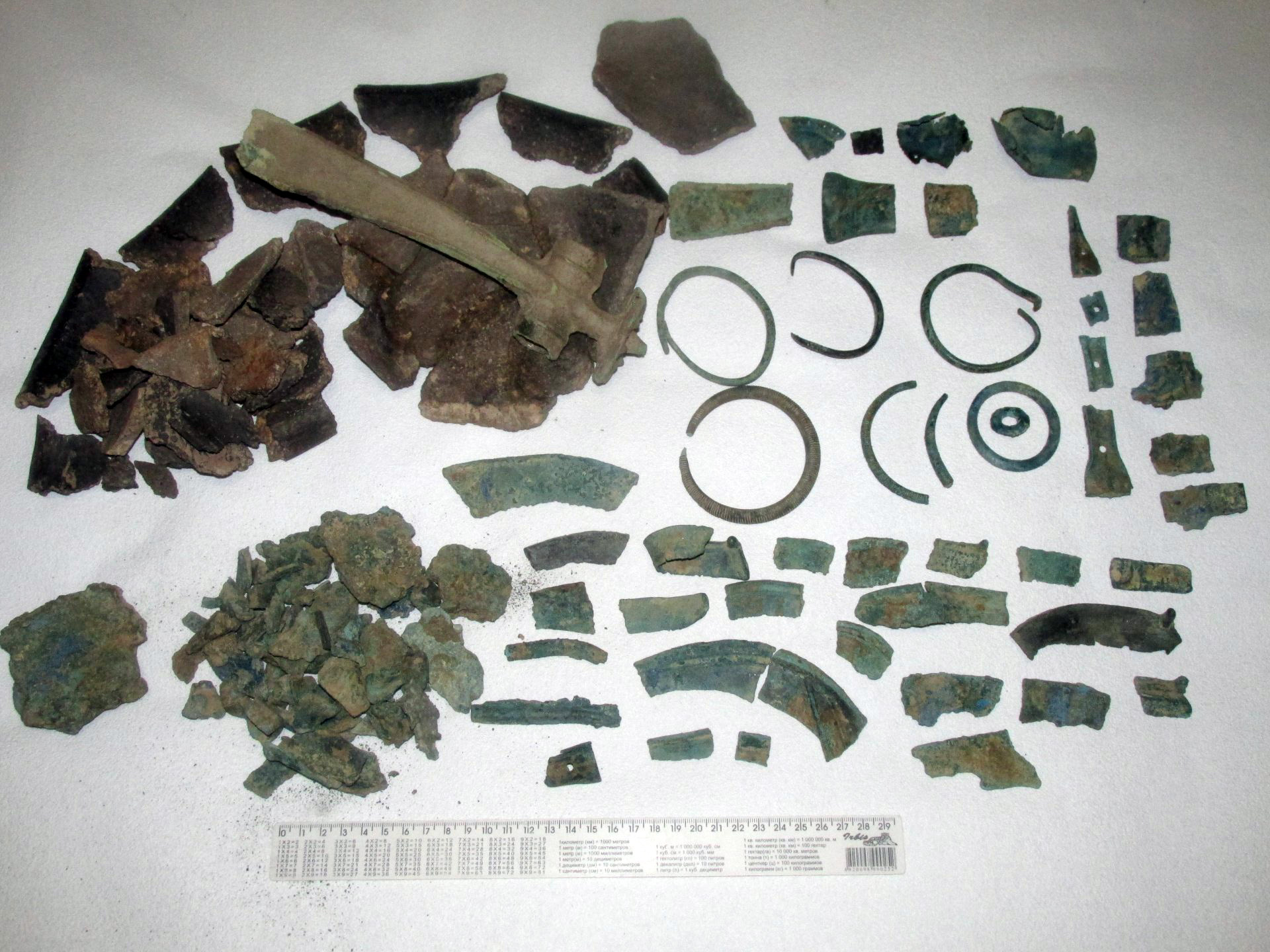 Часть керамики склеена клеем ПВА. Часть предметов слегка почищена. Среди обломков бронзы угадываются части зеркала и части серпа. Находка искателя kuvaz Кладоискатель Виолити.