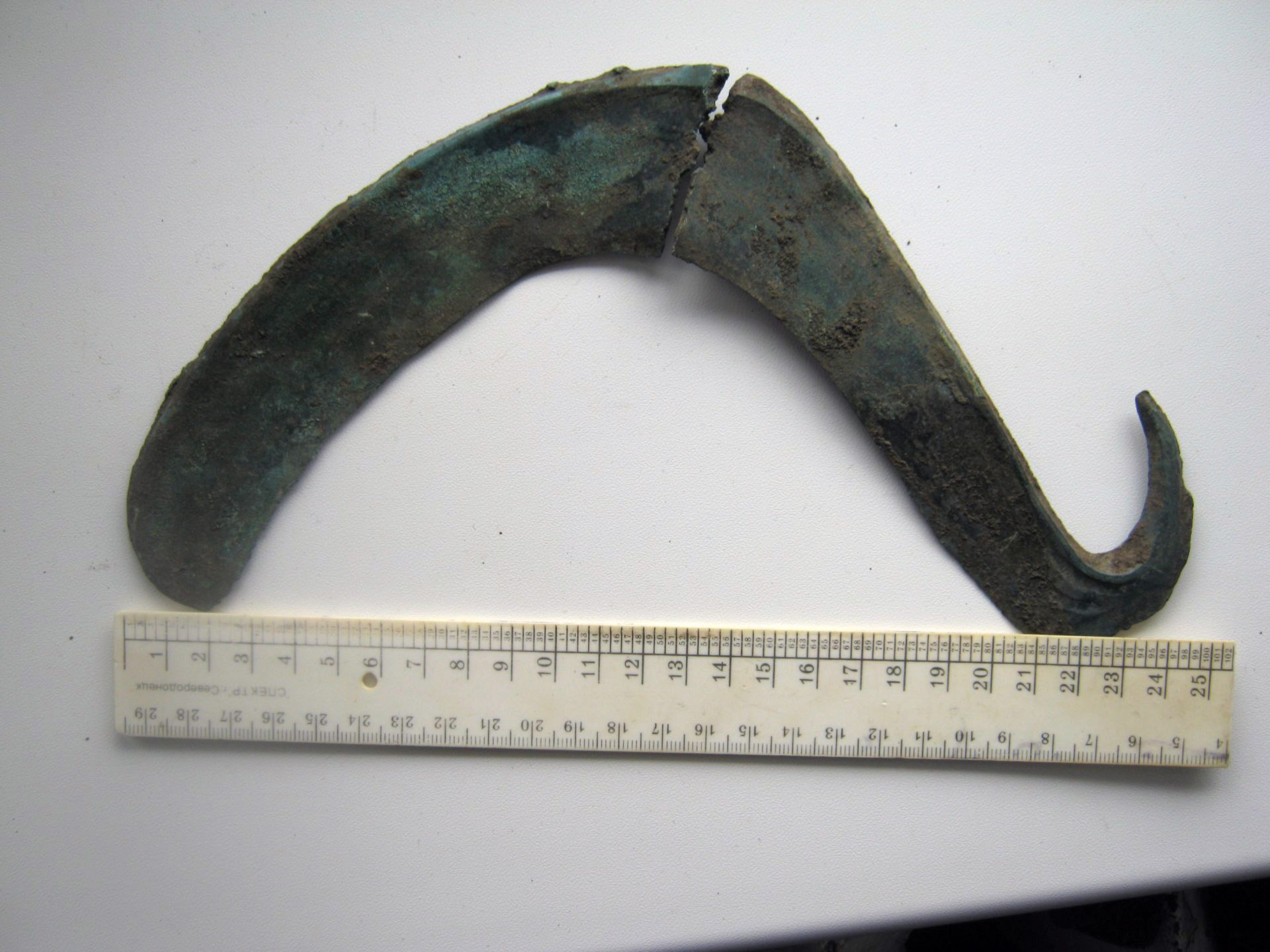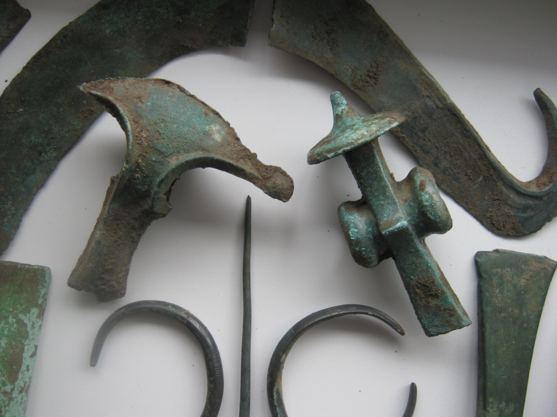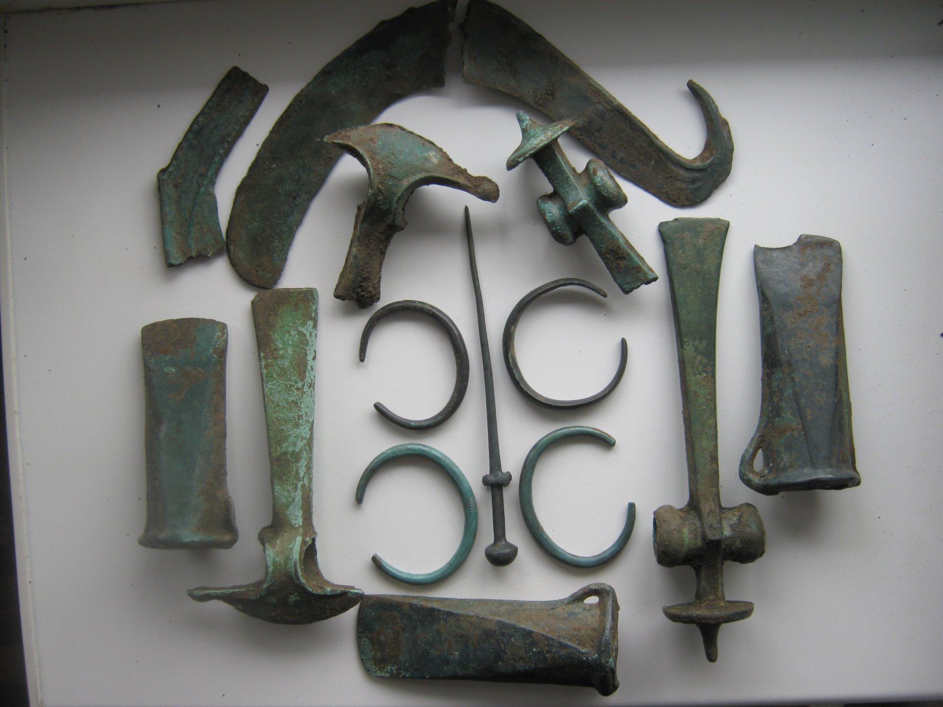Находка искателя шчасливчик Кладоискатель Виолити. В комплексе-2 топорика Гальштатского типа, 2 обломка топориков, 3 кельта. 4 браслета (3 с узорами), веретено или заколка, серп (переломан пополам), бронза или медь – около 4,5кг, свинец – около 2 кг.