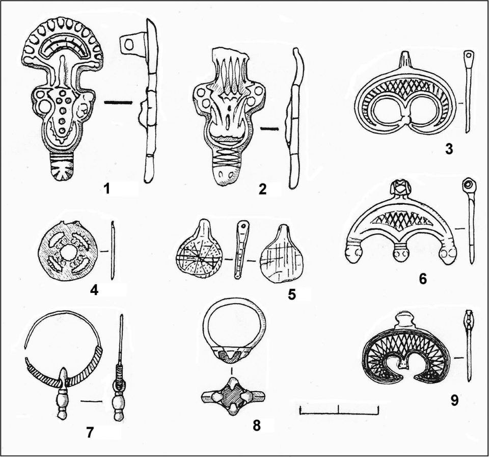 Новые находки ювелирных украшений славян были обнаружены автором во время спасательных работ на славянских памятниках VIII-X вв. в регионе в 2006-2009 годах. К ним относятся две фибулы, три лунницы, две подвески, височное кольцо и перстень (рис. 1).