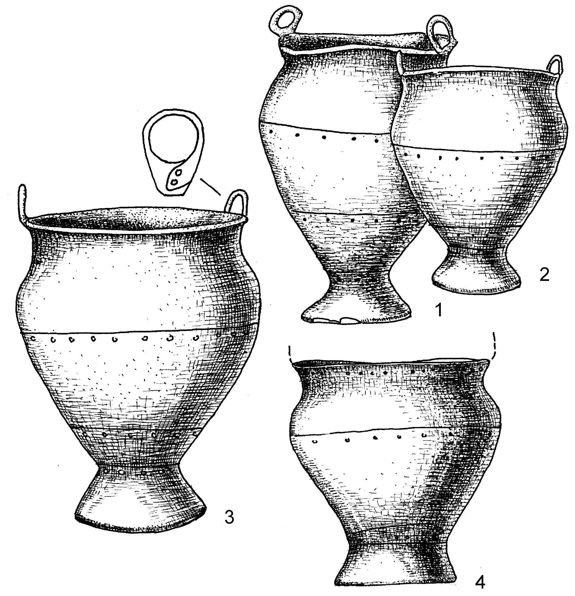 Во-первых, форма клепаных сосудов с Антонин, Подолье и Тараще почти тождественна: тюльпаноподибный профиль классического образца в сочетании с стройностью тел всех трех экземпляров (рис. 1, 1-3). Зря Т. Вегжинович попыталась поставить под сомнение справедливое наблюдение Олега Ивановича о том, что три котла из Западной Украины, которые по его словам имеют элегантную форму, без колебаний находят прототипы среди белогрудовской и раннечернолеской посуды [Terenozkin, 1962, s. 274; Węgrzynowicz, 2001, s. 43]. Добавим, что очень похожий профиль к котла с Подолья имеют и большинство тюльпаноподибной сосудов с зольника в Жукове и из могильников высоцкой культуры в ранней - и позднеклассической фазах ее развития (например, Петрикова пох. № 27; кенотаф - 1; пох. № 99; захр. № 131), недавно выделено в высоцко-белогрудовскую культурно-историческую общность [Бандривский, 2002, с. 33, рис. 11,4, с. 54, рис. 22,1, с. 91, рис . 32,1, с. 105, рис. 35,1; 2005, с. 244].