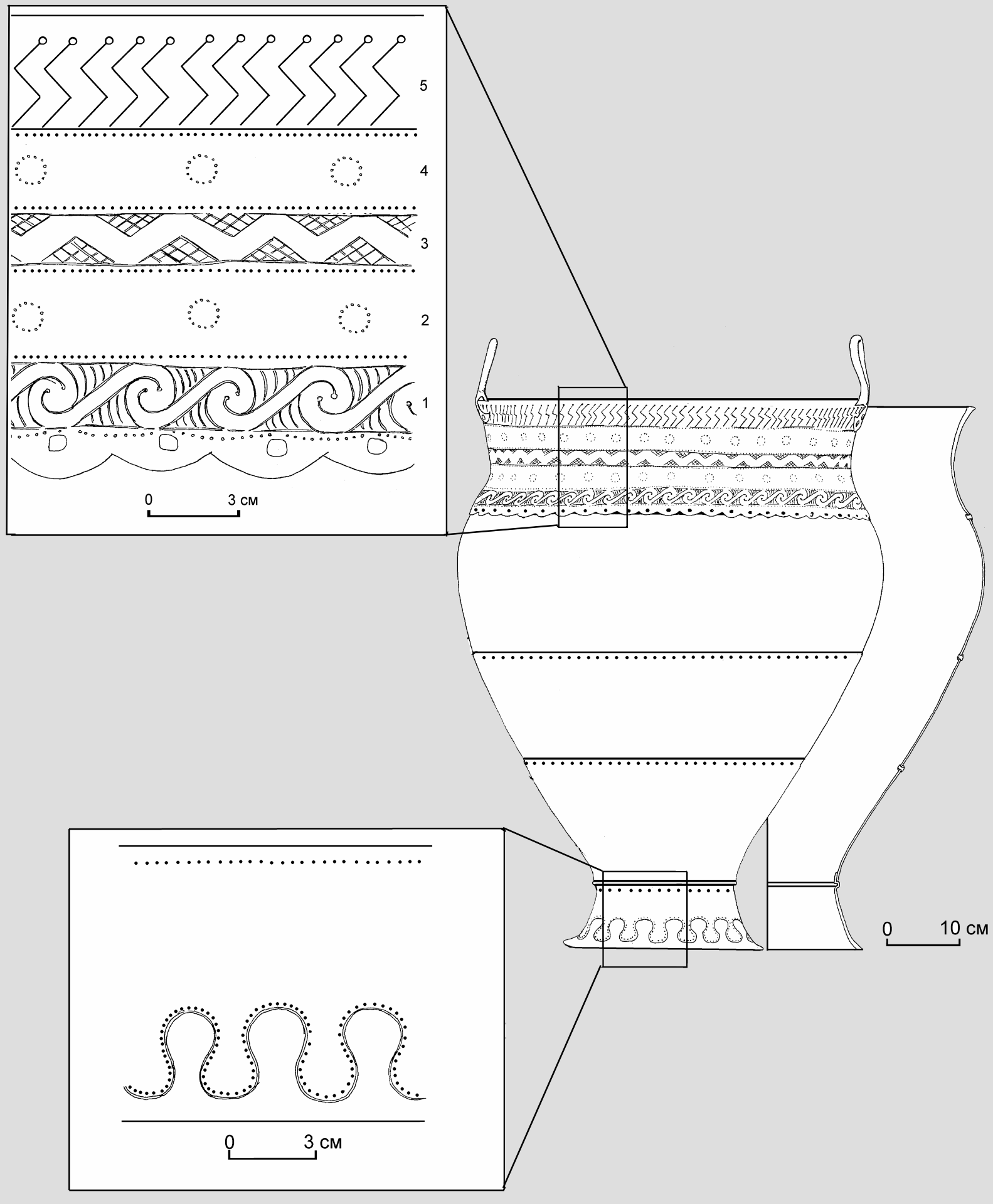 И, наконец, самую интересную и территориально смежную параллель к орнаменту на сосуде из Подолья, которую анализируем, представляет типично микенский спирально-меандровий декор все той-же "бегущей волны", которая присутствует на втулке одного из серебряных копий в известном Бессарабском (Бородинском) комплексе, который в научной литературе принято интерпретировать как клад.2 в первой своей работе А. Тальгрен датировал Бессарабский (Бородинский) клад 1600-1300 годы до н.э. [Tallgren, 1925, s. 312-314], а А. Тереножкин ХVI-XV вв. до н. э. [Тереножкин, 1976, с. 188-189]. Кратко соединены между собой волюты, которые изображены внизу втулки на бессарабскому (Бородинском) копье, здесь так же, как и на сосуде из Подолья, размещенные внизу всей композиции и обращены в один и тот же правый бок - за движением солнца. Сходство усиливается еще и тем, что над орнаментом в виде "бегущей волны" на втулке копья так же, как и на котле с Подолья, размещенная ряд заштрихованных треугольников [Березанская, Отрощенко, 1997, с. 467, рис. 174].