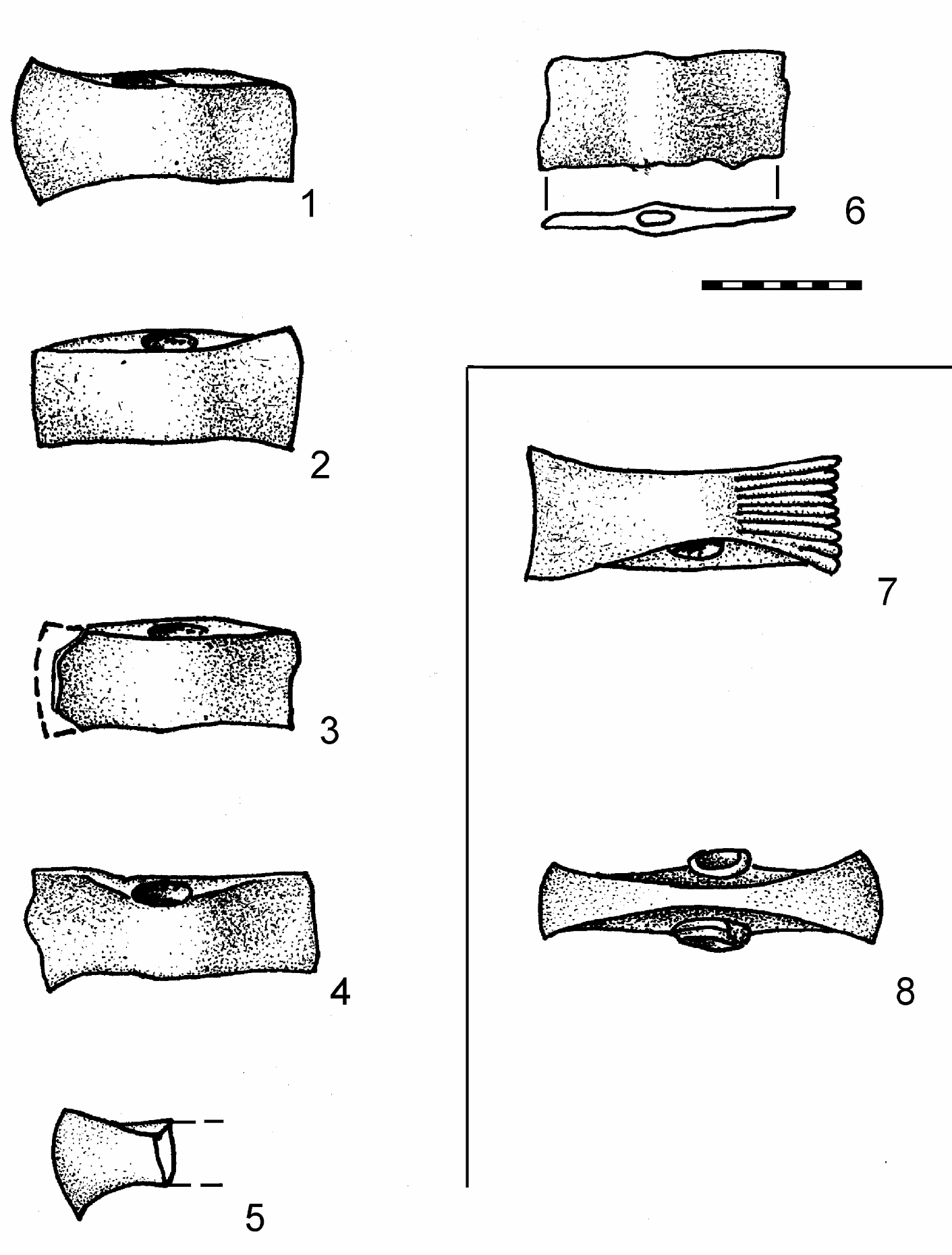 Последний из орнаментальных элементов, который опоясывает нижнюю часть пустотелого поддона котла из Подолья - ряд соединенных между собой омегообразный фигур в виде волны и ленты пунктира. Этот узорчатый ряд находит ближайшие аналогии среди декора редкого костяного псалия с Бэлза [Крушельницкая, 1976, с. 19, рис. 4,1; Крушельницкая, 1985, с. 17, рис. 4,1], который последние передатований на ХVI-XV вв. до н. э. [Бандривский, 2003, с. 8-18].