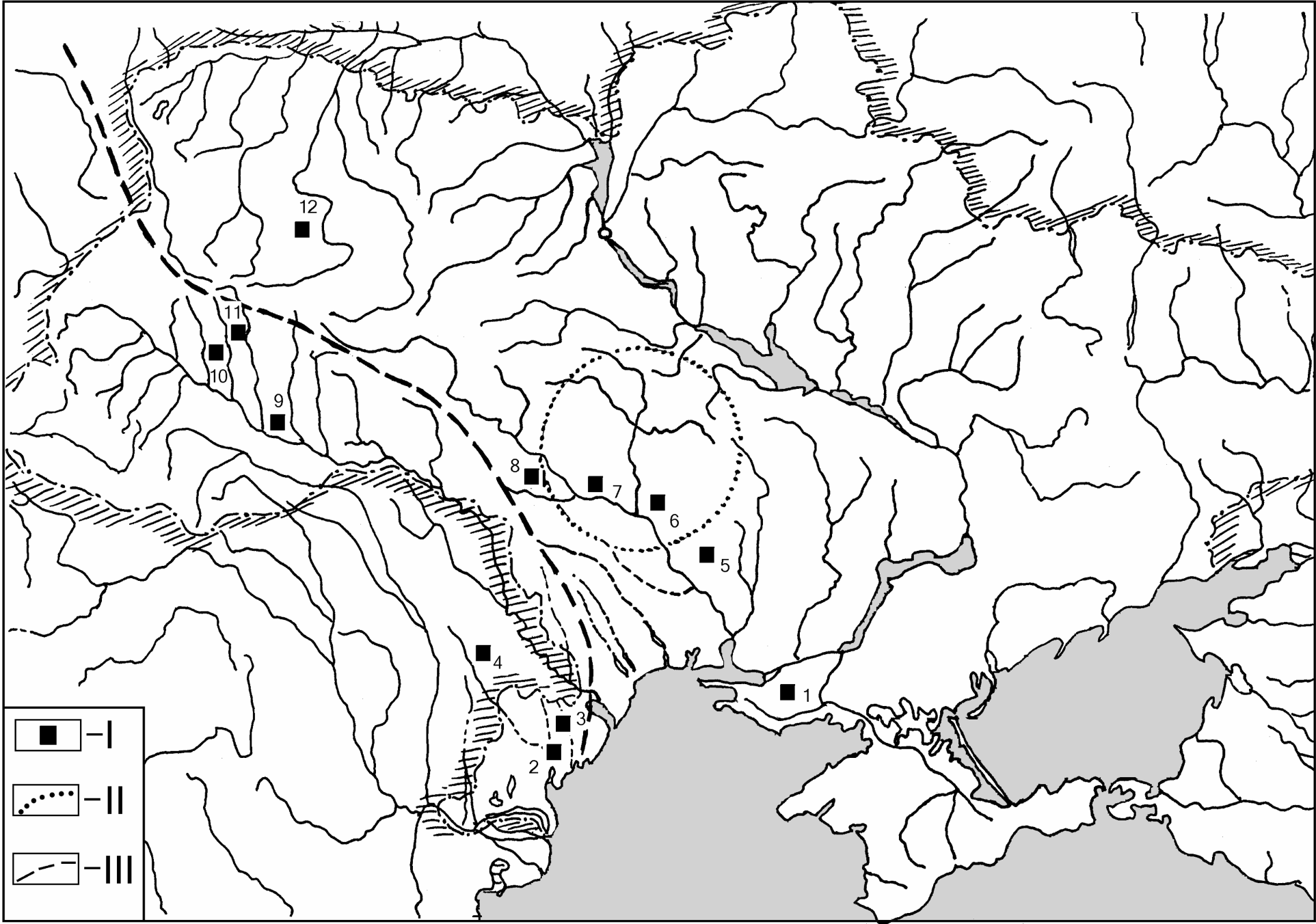 I - памятники позднего периода эпохи бронзы/раннего железа: 1 - Цюрюпинск (случайная находка) 2 - Борисовка (элитное захоронение) 3 - Бессарабский (Бородинский) клад; 4 - Лозовский клад; 5 - Козорезовский клад; 6 - Щетковский клад; 7 - Крижовлин (случайная находка) 8 - Гордеевка (могильник) 9 - Михайловский клад; 10 - Жуков (зольник) 11 - Петриков (могильник) 12 - Иванэ (элитные захоронения)