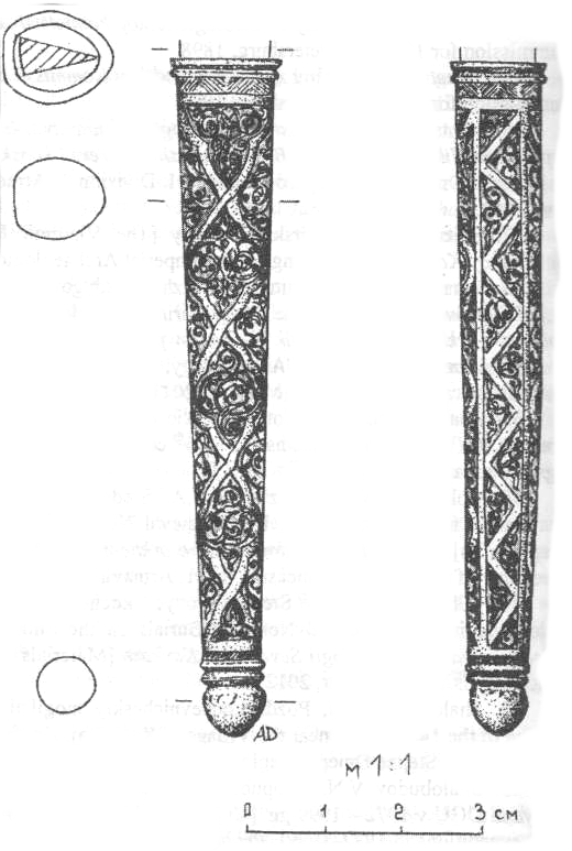 Первая находка1 происходит из раскопок Н. И. Веселовского, в конце 80-х гг. XIX в., близ гг Костромской бывшей Кубанской области. Боевой нож был обнаружен при исследовании погребения в кургане № 8 [34, с. 59]. Он представляет собой вогнутый треугольный в сечении клинок, который переходит в тонкий черен. На месте перехода насажен овальный в плане упор. Общая длина предмета – 42 см, длина клинка – 34,5 см, длина мерена – 7,5 см. Ширина спинки клинка. сужается к кончику от 1,3 см до 0,7 см. Ширина клинка у перехода в черен – 3 см, посередине – 2,7 см, в 9 см от кончика – 2,1 см (рис. 1). На конце боевого ножа сохранился серебряный конической формы наконечник ножен, его размеры: длина – 8,5 см, диаметр – 2,3x2,4 см. Поверхность наконечника гравирована растительным орнаментом из извивающихся тонких стеблей с отдельными вытянутыми листочками. Со стороны спинки поверхность наконечника ножен разделена двумя вертикальными валиками, а её пространство заполнено тем же растительным и, дополнительно, зигзагообразным орнаментом (рис. 2).