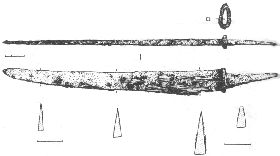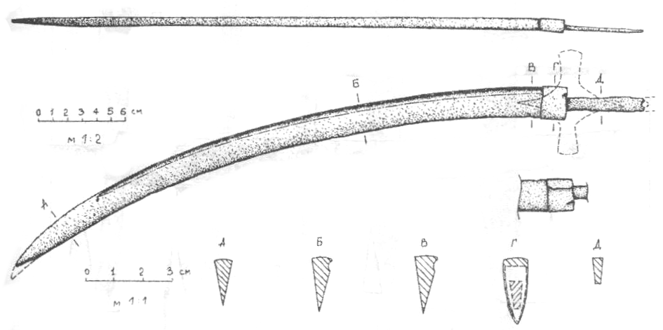 Также два очень схожих боевых ножа происходят с территории Древней Руси. Один из них обнаружен в ходе раскопок крепости Орешек [23, с. 72]. Он представляет собой вогнутый клинок, треутольный в сечении, переходящий в узкий черен. Под спинкой клинка, с лицевой стороны, находится дол, который почти доходит до кончика ножа, что аналогично описанной нами второй находке. На пяте клинка, ближе к спинке имеется клеймо в виде трёх округлых углублений. Общая длина предмета – 26,5 см, длина клинка – 20 см, длина черена – 6,5 см, ширина клинка – 1,7 см, ширина дола 0,2 см (рис. 7.6). Датируется находка по стратиграфическим данным 1-й половиной XIV в. Второй боевой нож был обнаружен при исследовании городища болховского города Божьск (Бужеск) [44, с. 63]. Он представляет собой вогнутый клинок, переходящий в достаточно широкий черен. Под спинкой клинка пущен узкий дол. На черене сохранились три заклёпки, которые фиксировали щёчки рукояти. Общая длина предмета – 30 см, длина клинка – 17 см, длина черена - 13 см, ширина клинка у пяты – 1,4 см, ширина черена – 1,5 см (рис. 7.7). Датироваться находка может 1256 г., когда Даниил Галицкий разгромил Болховские городища.