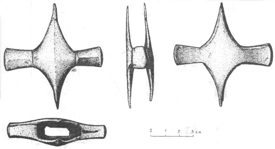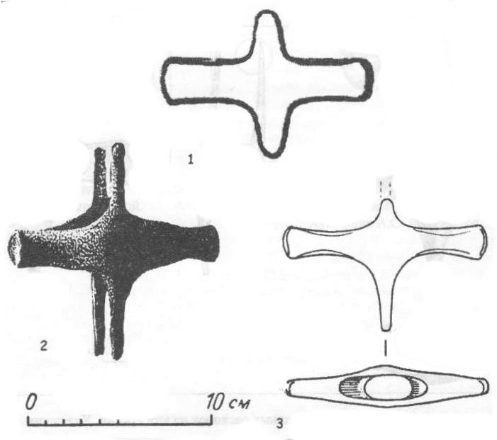 Ещё ряд аналогичных перекрестий происходит с древнерусских земель: одно найдено на городище летописного Клещина (рис. 9.2) [37, с. 110], второе – на территории русских земель Великого Княжества Литовского (ВКЛ), на Волыни (рис. 9.3) [24, с. 26], третье на Троицком XIII раскопе Великого Новгорода5. Их датировка не противоречит золотоордынским находкам.