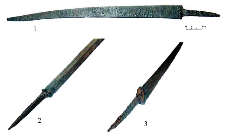 Рис. 5. Боевой нож из грунтового погребения 78 могильника Жукова. Художник М.В. Масалова Рис. 6. Боевой нож из несанкционированных раскопок в Харьковской области Украины: 1 - Общий вид; 2 - Спинка у основания; 3 - Лезвие у основания