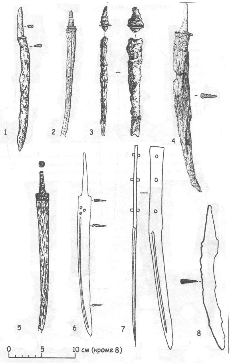 Рис. 9. 1 - Сабельное перекрестье из курганной группы у ст. Абинской [35]; 2 - Сабельное перекрестье с городища древнерусского г.Клещин [37]; 3 - Сабельное перекрестье с территории Волыни [24] Рис. 10.1 - Кинжал из кургана у ст. Новосвободной [19]; 2 - Серебряный наконечник ножен кинжала из кургана 38 Белореченского могильника [34]; 3 - Фрагмент кинжала с серебряным упором с местонахождения у д.Брик-Алга [11]; 4 - Кинжал, и его серебряный упор, из могильника Жако [1]; 5 - Серебряный наконечник ножен сабли из Белореченского могильника [34]; 6 - Серебряное навершие рукояти сабли из Белореченского могильника [34]; 7 - Серебряное навершие рукояти клинка из п.1 к.З курганной группы Каирка [13]; 8 - Серебряное навершие рукояти клинка из п.1 к.2 Градештского могильника [20]