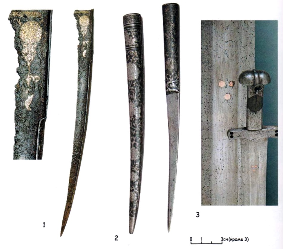 Ещё один аналогичный клинок происходит из византийской крепости Диножетья (рум. Dmogetia - Garvar), устье р. Сирет (Румыния) (рис. 7.8) [49, с. 357]. По своим размерам он близок зелотоордынским и древнерусским находкам. Возможно, это самая ранняя находка, румынский исследователь Петре Дьякону (Diaconu Petre) датирует её 1122 г. [49, с. 38]. Похожий боевой нож тгого же времени хранится и в собрании Фарусия. На клинке ножа сохранился плакированный золотом орнамент, на основании которого специалисты относят находку к продукту газневидских тружейников. Общая длина ножа, без обломанной рукояти, – 21,8 см [48, с. 150]. Единственное его отличие от выше описанной серии находок – это Т-образная спинка (рис. 8.1). Для Восточной Европы такой приём ранее начала XVI в. не известен, но к этому мы вернёмся ниже. В целом, для Ближневосточного региона есть ещё один боевой нож, который более походит на приведённую зами серию находок, он хранится в коллекции Столичного Музея Искусств г. Нью-Йорка в США. Нож представляет собой узкий изогнутый клинок, на который насажена цилиндрическая рукоять из серебра, общая длина предмета – 22 см. Сохранились и ножны, которые также изготовлены из :еребра. Обе серебряные детали украшены растительным орнаментом (рис. 8.2). Но, если касаться вопроса о происхождении подобных боевых ножей в Восточной Европе, то мы всё же склоняемся больше к византийской версии. В пользу этого свидетельствует клеймо на ноже из Орешка. Абсолютно аналогичное ему клеймо, но заполненное медью, присутствует в верхней части меча XIV в., который в 2008 г. был продан на торгах немецкого аукционного дома Hermann Historica рис. 8.3). По мнению экспертов аукциона, меч относится к продукту мамлюкских оружейников [46, № 406]. Между тем известный американский исследователь восточного оружия Д. Александр (Alexander David) считает, что это византийский тип мечей XIV-XV вв. [45, с. 87-89]. Ранее нами уже высказывалось предположение о том, что византийские мастера могли производить оружие для нужд Золотой Орды [26, с. 90].