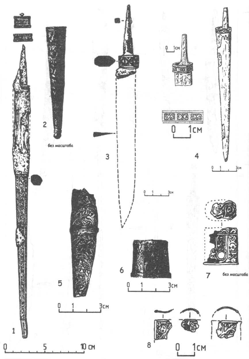 Боевой нож из кургана 8 у ст.Костромской Серебряный наконечник ножен ножа из кургана 8 у ст.Костромской