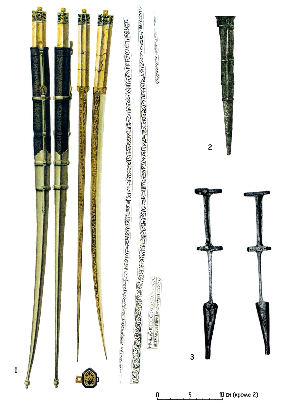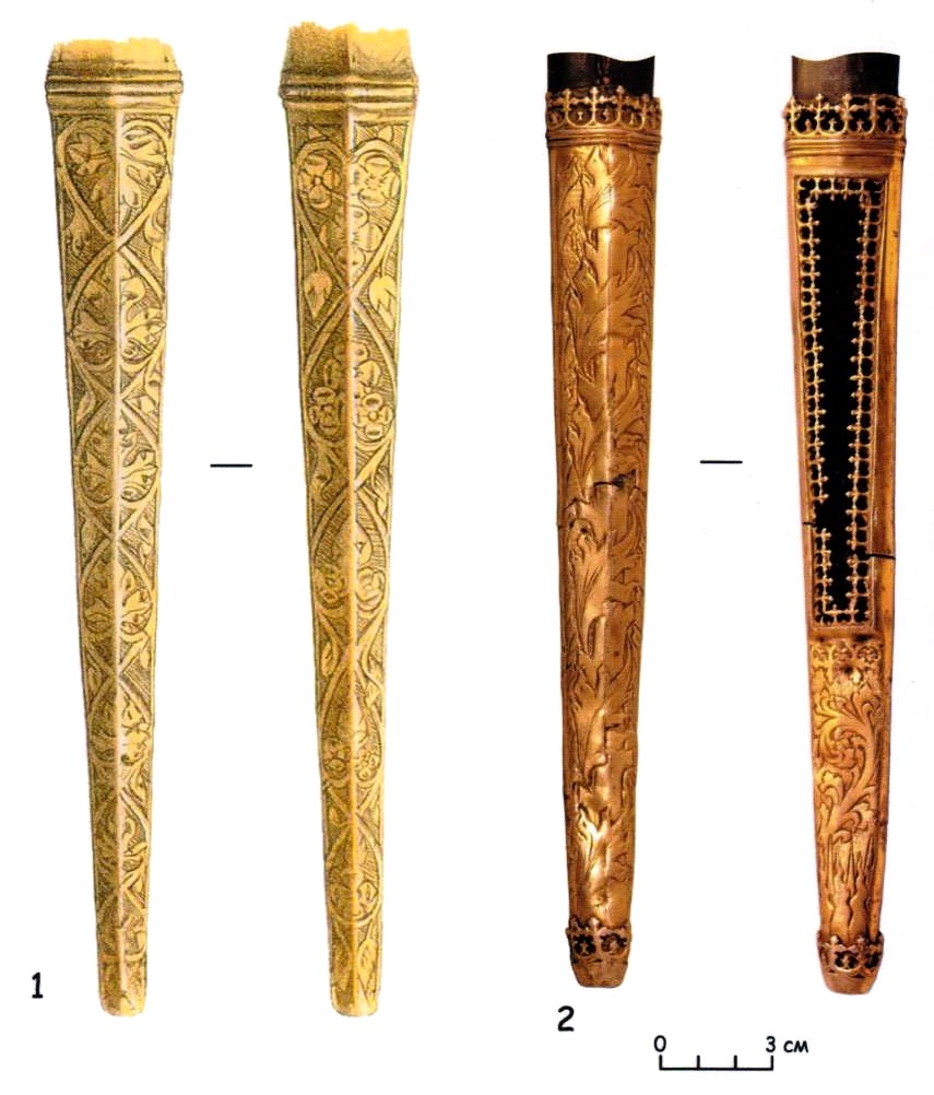 В целом, гравированные серебряные приборы характерны для золотоордынских кинжалов и сабель 2-й половины XTV-1-й половины XV в. В качестве примеров можно привести гравированные серебряные упоры кинжалов с местонахождения у деревни Брик-Алга (Башкортостан (рис. 10.3) [11, с. 77], и из могильника Жако, Карачаево-Черкесия (рис. 10.4) [1, с. 351], навершие одной из сабель (рис. 10.6), и наконечник ножен другой (рис. 10.5) из Белореченского могильника [34, с. 9], навершия рукоятей клинков из п. 1 к. 3 курганной группы Каирка (Запорожская обл.) (рис. 10.7) [13, с. 239] и п. 1 к. 2 Градсштского могильника (Одесская обл.) (рис. 10.8) [20, с. 89]. Мы не исключаем, что эта традиция могла прийти из Западной Европы, где она хорошо известна в оформлении ножен очень дорогих клинков. Речь идёт о конических наконечниках ножен двух мечей-реликвий, один из которых изначально хранился в Аббатстве Битвы (Battle Abbey) (Восточный Сассекс, Англия) (рис. 11.1) [50, с. 462-475], а второй так называемый «меч Довмонта». хранится в г. Пскове (рис. 11.2) [3, с. 66-73]. Оба наконечника ножен, как и в нашем случае, конической формы, изготовлены из серебра, гравированы растительным орнаментом. Единственное их отличий – это размеры и то, что они дополнительно украшены позолотой, но последнее можно объяснить более высоким статусом вещей. В целом, обе реликвии относятся ко 2-й половине XTV - началу XV в. В пользу нашего предположения свидетельствует и тот факт, что наконечник ножен из кургана 38 Белореченского могильника входил в состав ножен (рис. 12.2), которые относятся к хорошо известному по материалам Западной Европы типу (рис. 12.3) [47, с. 186, рис. 13: 51, с. 91-105, рис. 35.5]. При этом весьма интересным фактом является то, что так называемый «нож князя Андрея Ивановича Старицкого» 1513 г., который, скорее всего, является позднейшим развитием публикуемых нами боевых ножей, имеет ножны, ничем не отличающиеся от упомянутых нами выше западноевропейских образцов (рис. 12.1) [36, с. 103-104].