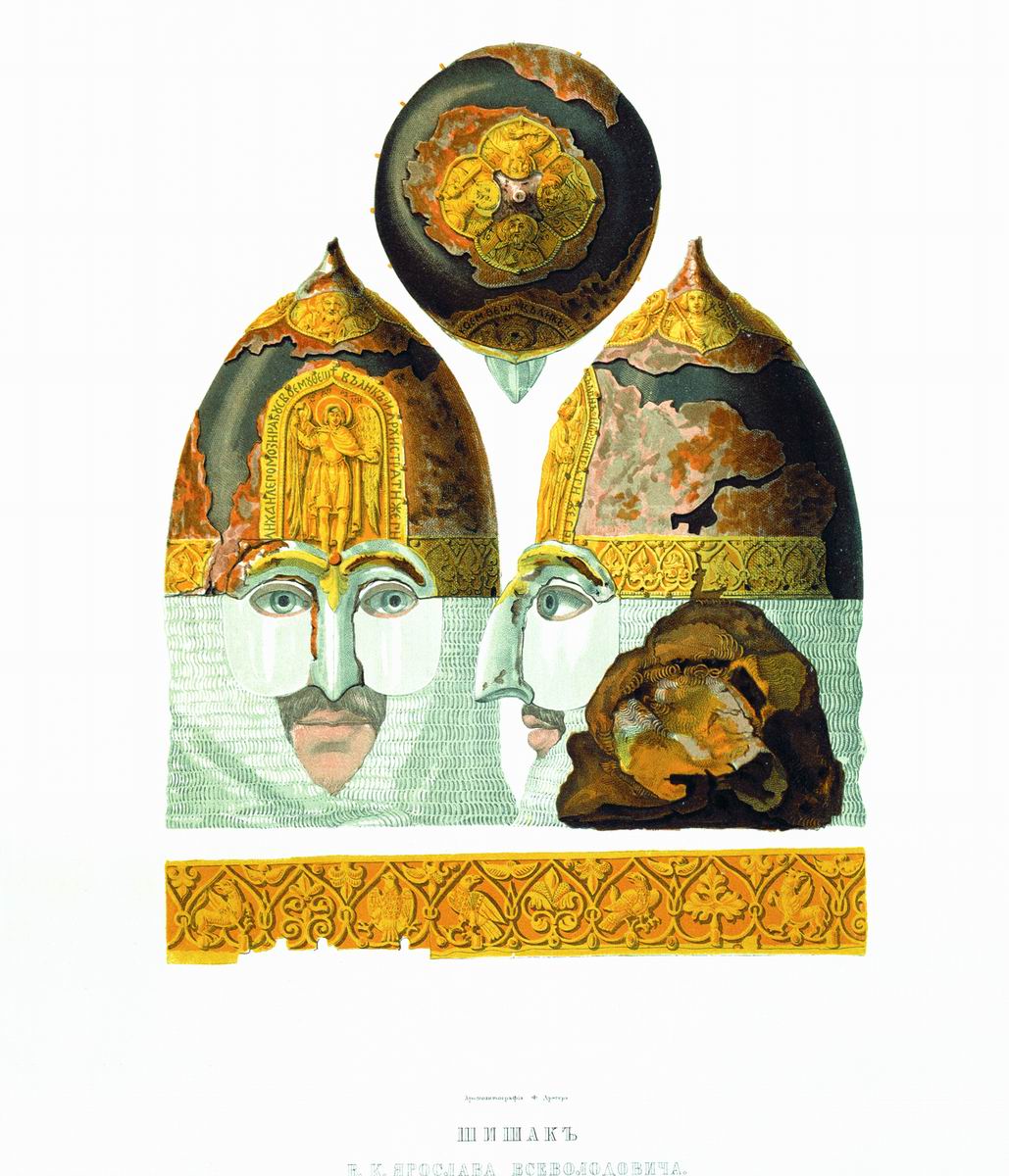 Шлем князя Ярослава также можно считать своего рода инсигнией. Он украшен не только накладными чеканными по золоченому серебру священными изображениями, о которых мы говорили выше, но и широким серебряным орнаментированным ободом, уподобляющим воинское наголовие венцу-стефаносу византийских кесарей.