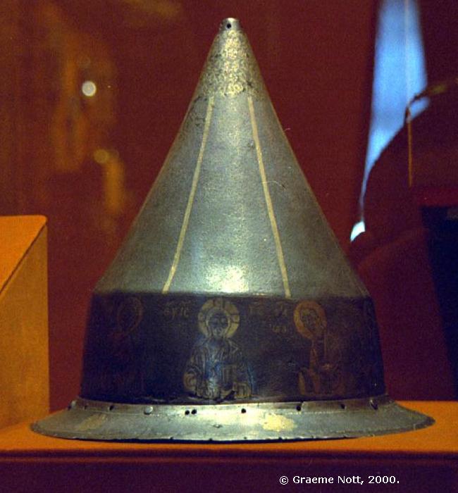 Таким образом, ни художественные особенности Деисуса на шлеме, ни палеография его надписей, ни орнаментация не дают оснований считать его собственно византийским произведением. Данное боевое оголовье было изготовлено на Руси и с византийской культурой может быть связано только в широком смысле.