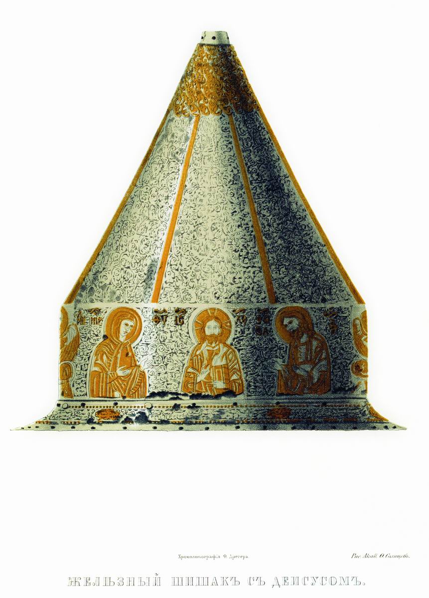 Предание о принадлежности шлема великому князю Александру Невскому было отражено в подписях к его изображениям, сделанным Ф.Г. Солнцевым14. Однако при воспроизведении этих изображений в «Древностях Российского государства», увраже, задуманном А.Н. Олениным, но изданном уже после его смерти, шлем, как и в описях царской казны, был назван «Шапкой с деисусом»15. Там же было указано, что надписи у фигур святых греческие и что в рукописной Описи Оружейной палаты 1835 г. шлем числится как «Шишак греческий»16. В следующую Опись Оружейной палаты, изданную в 1884 г., шлем вошел как «Шапка с деисусом» без какой-либо атрибуции и датировки17, но вплоть до начала XX в. он экспонировался в музее как «Шишак греческий, XIII в.»18