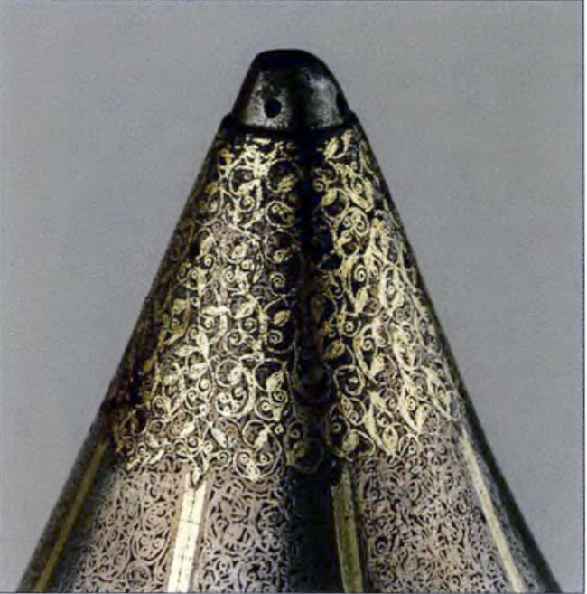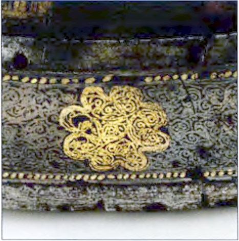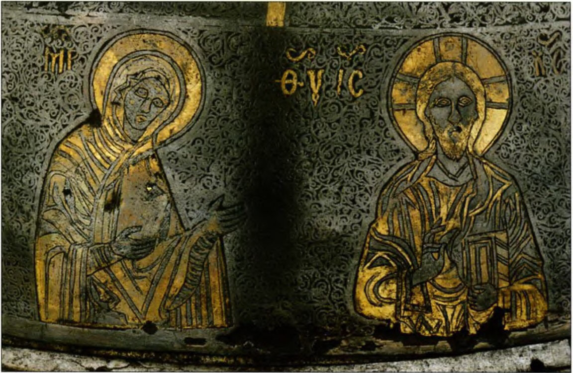 Единственное известное нам визан тийское боевое наголовие со священным изображением, выполненным золотом по стали – шлем XIV в., найденный в долине р. Хургишки в Румынии44; плохо сохра нившиеся элементы его декорации (справа на очелье – полуфигура святого воина в императорской короне, выше – части орнамента) наведены золотом по графье. Хотя судить о технологических особенностях по фотографии трудно, это контурное изображение скорее всего также насечено золотом, но какой-либо светотеневой моделировки, в отличие от Деисуса на шлеме, здесь нет.