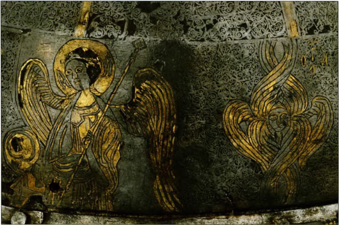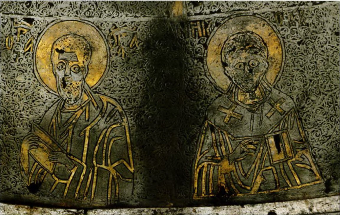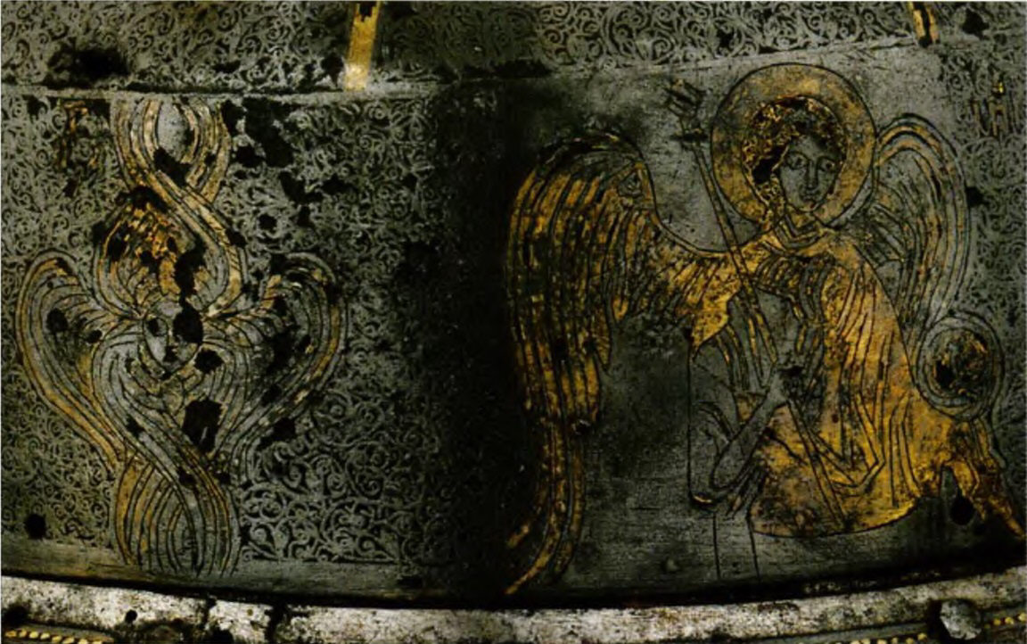 Шлем выделяется и особой роскошью декорации: вся его поверхность украшена золотыми и серебряными ленточками или тонкими пластинами, соответствующими деталям изображения; они набиты на стальную поверхность, проработанную насечкой5. Верхняя треть конической части шлема покрыта крупным золотым узором из тонких извивающихся стеблей с отдельными вытя нутыми листочками, в промежутках золотых стеблей едва заметны серебряные завитки (ил. 3), нижняя граница этого узора неровная6. Ниже тулья шлема разделена на секторы восемью дорожками, состоящими из нескольких узких золотых ленточек. Между дорожками расположен более мелкий и густой узор из серебряных «калачиков» с завитками и листиками внутри. Этот узор переходит и на цилиндрическую часть шлема, которую исследователи традиционно именуют венцом7. Она украшена полуфигурными священными изображениями, для которых в узоре оставлены резервы, соответствующие их контурам, лишь вокруг фигур архангелов с распростертыми крыльями сложного контура фон частично гладкий. Изображения крупные, четко читаемые, их высота равна высоте венца шлема, однако срез фигур архангела Михаила, апостола Петра и святителя Николая не доходит до края венца шлема. На очелье – благословляющий Христос Вседержитель, по сторонам, в молении — Богоматерь и Иоанн Предтеча, за ними – два архангела в пышных одеяниях, со сферами и мерилами, два прямоличных шестокрыла, обращенные к Христу апостолы Петр (с кодексом) и Павел (со свитком) и прямоличный святитель Николай Мирликийский (с кодексом). Изображения выполнены глубокой графьей и инкрустированы серебром и золотом (ил. 4-9). Двойные очерки золотых нимбов (у Христа-крестчатого геммированного) выложены серебром, личное и освещенные участки одеяний — серебром, затемненные – золотом. Последовательно этот принцип соблюден лишь в изображения Христа и Иоанна Предтечи. Тонкая светотеневая моделировка ликов — веки и зрачки, морщины на лбу и «притенения» на щеках и носу – выполнена здесь золотом, волосы и бороды искусно выложены отдельными завитками из золотой проволоки. Сдвоенные складки одеяний Христа и Иоанна Предтечи переданы тщательно и убедительно, у Богоматери, архангелов и других персонажей расположение складок схематичное, а притенения в ликах приобретают геометрические очертания (на лбу апостола Петра), волосы и бороды заполнены однотипными золотыми колечками. Образы апостолов и святителя Николая большеголовые, упрощенного рисунка, с грубо моделированными чертами ликов.