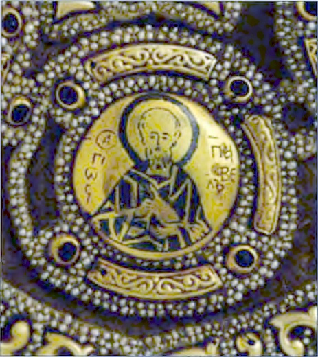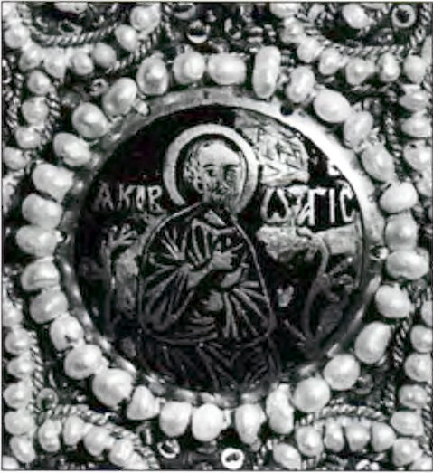 Русских драгоценных княжеских венцов со священными изображениями, подобных венцам императорским, которые считались в Константинополе богоданными святынями59, мы не знаем. Венцы византийского типа условно переданы на золотых и серебряных монетах Владимира Святосла вича (конец X - начало XI в.) и серебряных монетах Святополка (1015/1016 и 1018 гг.)60, матрицы для которых были изготовлены по константинопольским образцам. Но священные изображения могли быть и на княжеских шапках61, что показывает изображение золототканой шапки князя Ярополка Изяславовича, молящегося апостолу Петру, в композиции на л. 5 об. Молитвенника Гертруды (Трирской Псалтири) из Национального археологического музея в Чивидале. На очелье этой шапки, украшенной жемчужинами и камнями, – киотец в форме арочки, что указывает на священное изображение, которое в реальности могло быть выполнено на золотой пластине в технике перегородчатой эмали; такой же киотец – на венце княгини Гертруды, стоящей рядом с князем62.