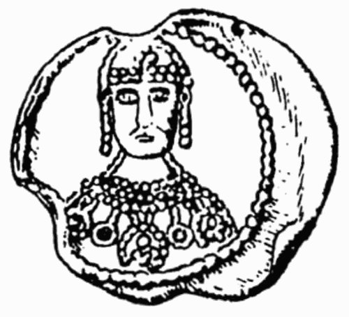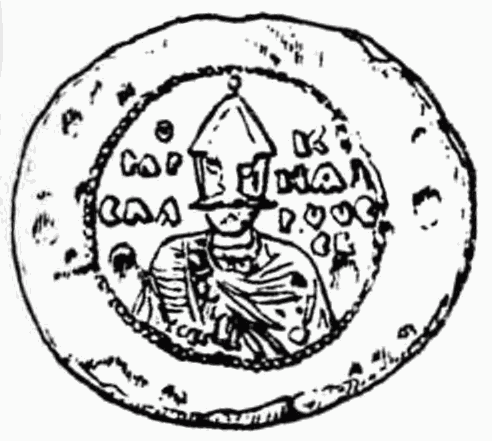 Болгарский князь Симеон Великий (864-927), ставший в 893 г. архонтом Болгарии, представлен на своей печати (ил. 16) в богато украшенном уборе, напоминающем царский венец, дополненный стеммой и подвесками-перпендулиями; этот убор реконструируется исследователями как парадный шлем, напоминающий шлемы-регалии первостроителей христианской ойкумены — великих императоров Константина и Юстиниана54. Князь Ярослав Владимирович (1010-1054) также представлен на своей печати в островерхом шлеме или высокой шапке55 (ил. 17). В высоком шлеме с перпендулиями (?) изображен на своей печати император Трапезундской империи Алексей I Великий Комнин (1204-1222) (ил. 18). Примечательно, что на изображениях князей Бориса и Глеба на русских печатях XII в., как и на шлеме Симеона Великого, мы видим прикрепленные к невысоким шлемообразным шапкам императорские перпендулии56 (ил. 19).