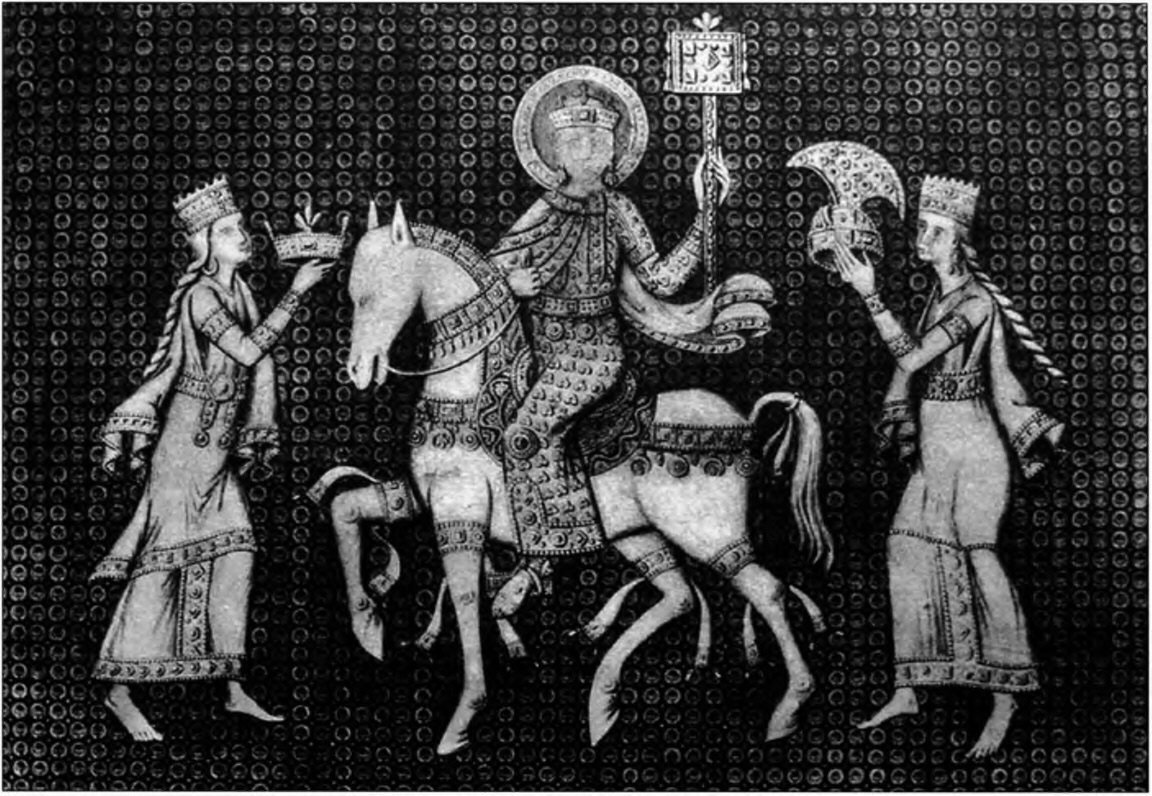 Традиция украшения шлемов, которые всегда были не только доспехами, но и знаками отличия и апотропеями, восходит к глубокой древности. Именно золотой шлем языческих вождей, символизирующий могущество и богатство, был предшественником венца средневековых государей. Несомненно, что шлемы, наряду с венцами, играли определенную роль в торжественном церемониале христианских государей, однако до нас дошли лишь фрагментарные свидетельства об облике и способе использования средневековых инсигний в целом47.