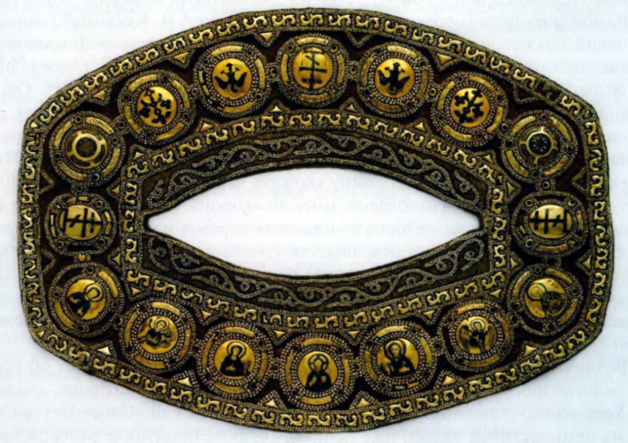 Деисус был знаком силы и премудрости, праведного суда. Наиболее близким шлему по времени является поясной семифигурный Деисус, выполненный в технике гравировки, чернения и золочения на нашивных серебряных дробницах (ил. 22), украшающих оплечье саккоса митрополита Алексия (1364)69, игравшего в тот период важную роль в государственной жизни Руси. Это оплечье, напоминающее диадиму византийских императоров, дает представление о недошедших до нас бармах московских великих князей XIV в.70