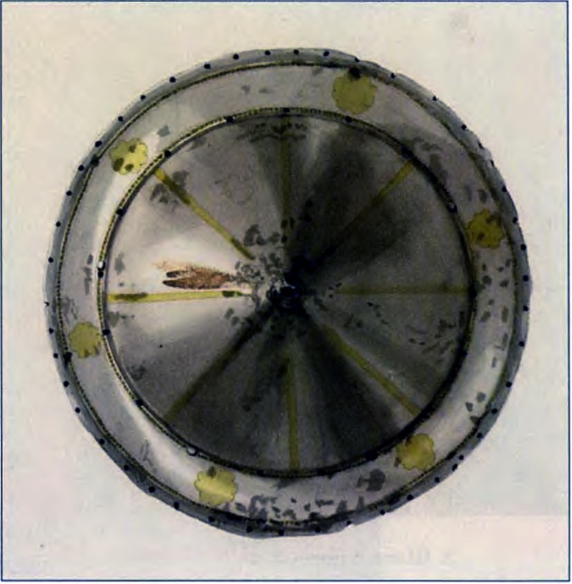 Заслуживает внимания уже сама форма шлема: он крупный, высокий, цилиндроконический, с широкими полями, приклепанными под небольшим углом к нижнему краю тульи. Корпус шлема выкован из цельного стального листа 1-1,5 мм в сечении, вверху – технологическое отверстие, которое первоначально было закрыто навершием (ил. 2), крепившимся в четырех местах (одна заклепка сохранилась); конусообразный верх имеет едва уловимую усадку вовнутрь, высокая тулья в середине слегка расширяется, что улучшает защитные функции. В ее нижней части — две пары небольших отверстий для крепления подбородочного ремня. Отверстия расположены на равном расстоянии друг от друга (13 см), на лицевой стороне шлема расстояние между парами 26 см, на тыльной – 18 см.