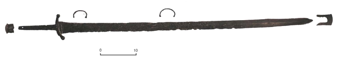 Основная часть элементов комплекса хорошо известна по другим памятникам региона. Перекрестья такого типа широко распространены в кочевнических памятниках IX-XI веков5. Форма наконечника ножен находит аналогии в венгерских древностях X века6. С-образные портупейные скобы характерны для оружия VIII-X веков7, а в аланских древностях Северного Кавказа бытуют до XII века8. Форма клинка находит аналогии с образцами из Дюрсо9 и Сухогомольшанского могильника10, датируемых IX веком.