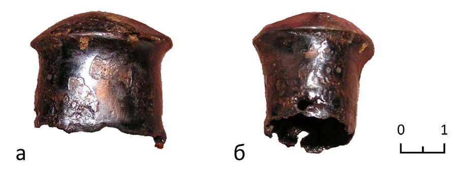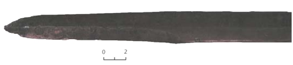 Наконечник ножен имеет форму уплощенного цилиндра, высотой 52 мм, сечение у донца 35 × 17 мм, сужается к устью до 32×15 мм (рис. 6). Донце искривленное, смонтировано из плоской пластины. На расстоянии 10 мм от устья по коротким сторонам имеются отверстия для крепления наконечника к ножнам. Наконечник со стороны устья имеет широкие вырезы. Цилиндрическая часть наконечника состоит из двух частей. Лицевая сторона так же как и боковые стороны сформированы из свернутого листа. На оборотной стороне в придонной части этот лист соединяется с помощью наложения подпрямоугольного листа металла, размерами 32×15 мм. Все части наконечника соединяются с помощью пайки. На лицевой стороне имеется рисунок в виде распускающегося бутона.