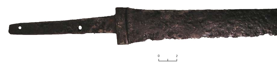 Наклон рукояти у сабли отсутствует, хвостовик смещен от центра в сторону спинки клинка. Хвостовик имеет длину 122 мм, ширину 19 мм у основания и 10 мм у конца, 15 мм в центре. Толщина хвостовика варьируется: у основания клинка ширина составляет 4,5 мм, плавно сужаясь до 2 мм на конце хвостовика. На хвостовике расположены два отверстия диаметром 3-4 мм, для крепления неметаллических обкладок рукояти. Отверстия расположены на расстоянии 38 и 105 мм от основания клинка (рис. 3).