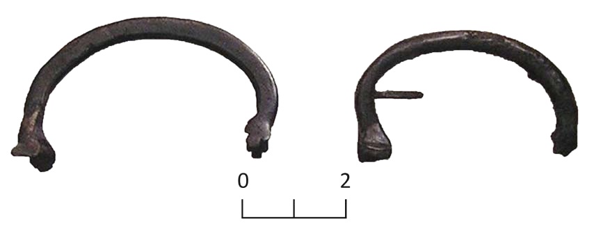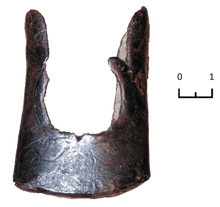 Портупейные скобы С-образной формы размерами 4,8×2,8 см и 4,3×2,6 см, выкованы из серого металла. Ширина скоб 5 и 4 мм. Скобы изготовлены из листа толщиной около 1 мм, сечение П-образное с расстояние между щечками 3-2 мм. С двух сторон скобы имеют отверстия, в одном из которых сохранился гвоздик. В месте крепления к ножнам находятся фигурные расширения, напоминающие некий цветочный орнамент (рис. 5).