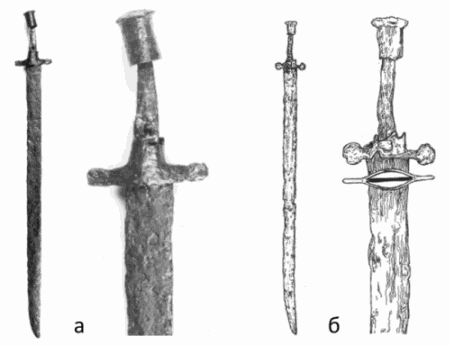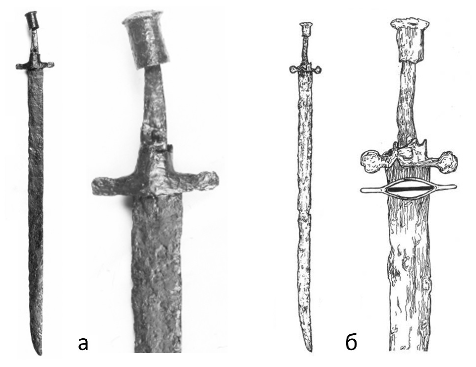 Рис. 8. Сабля неизвестного места находки из Болгарии (а) и сабля из древневенгерского могильника в районе Оломоуца, Чешская Республика (б) (по В. Йотову).