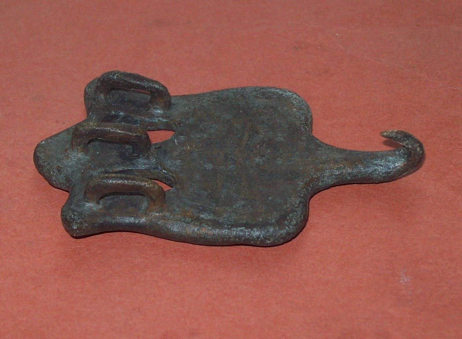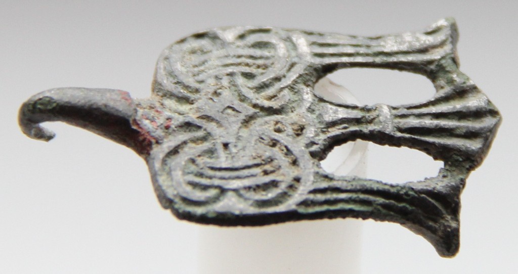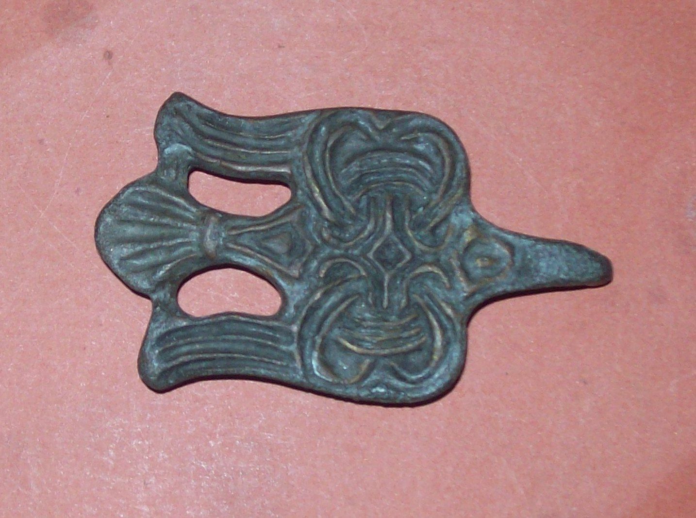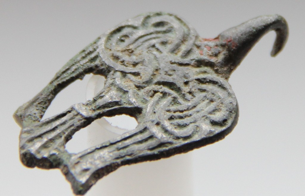 Данный крюк очень похож на недавнюю находку на Старой Ладоге часть формы для отливки, как указали журналисты – «печати Рюрика». Несмотря на то что датировка его 930 год и отливали из неё не печати, а принадлежности мужского костюма. Конкретно крючок для фиксации обмоток голени. Перемычки соединяющие хвост и крылья нужны для фиксации обмоточной ленты.