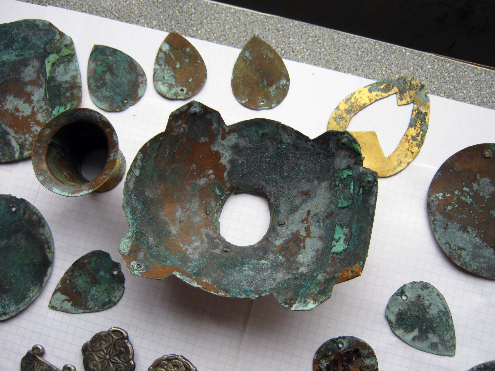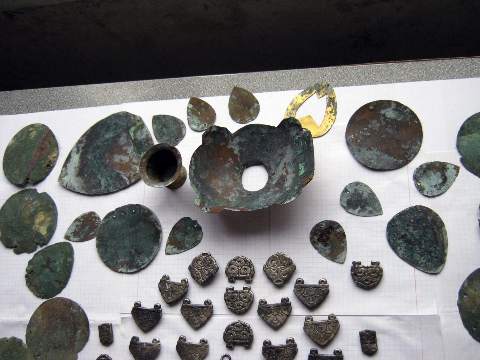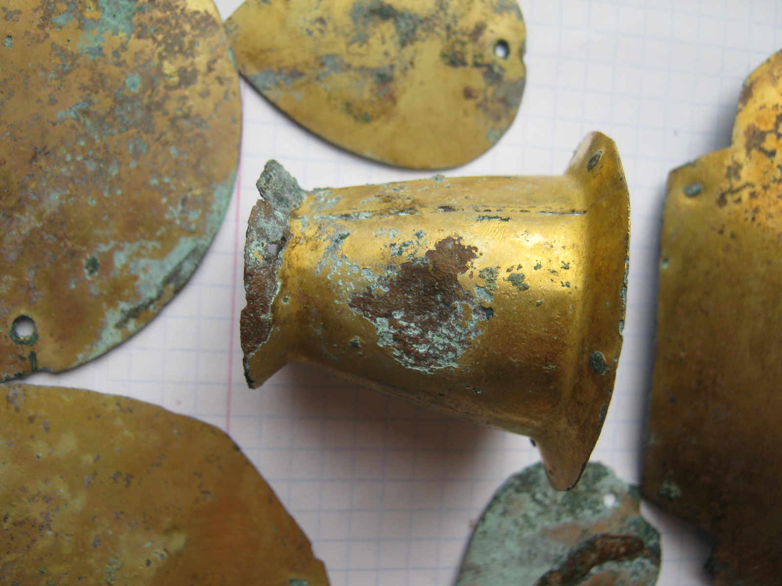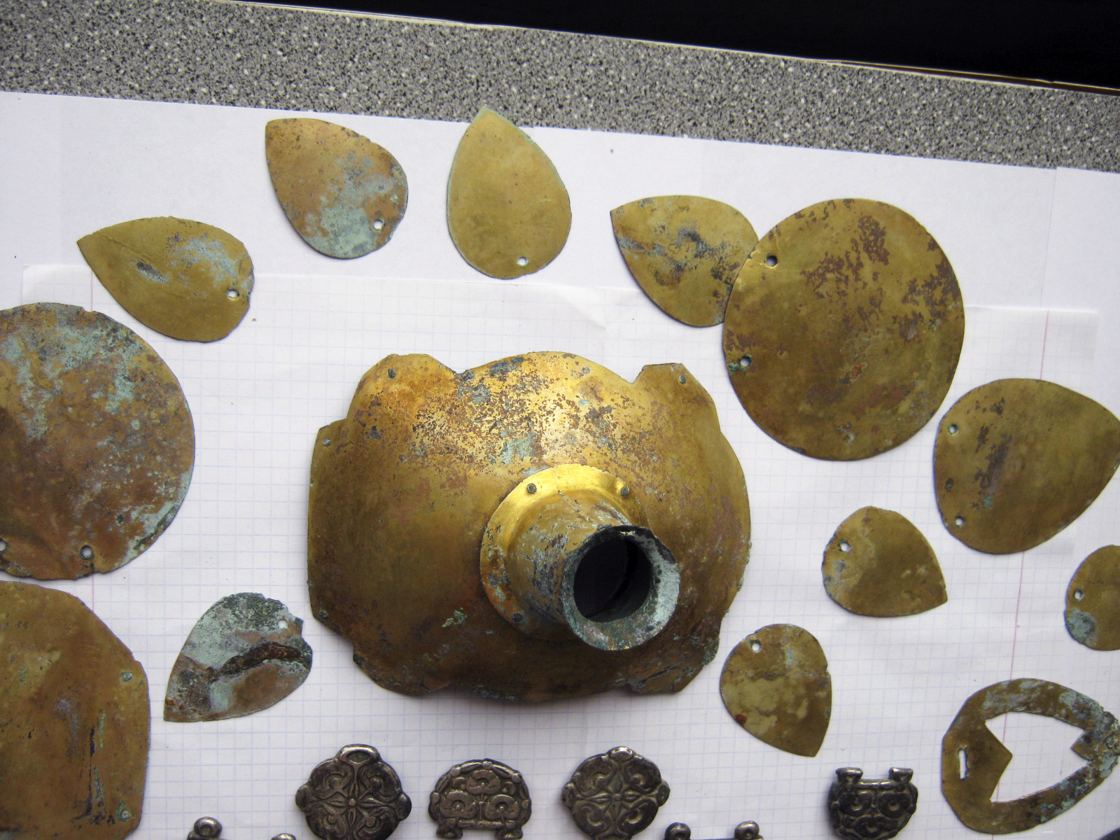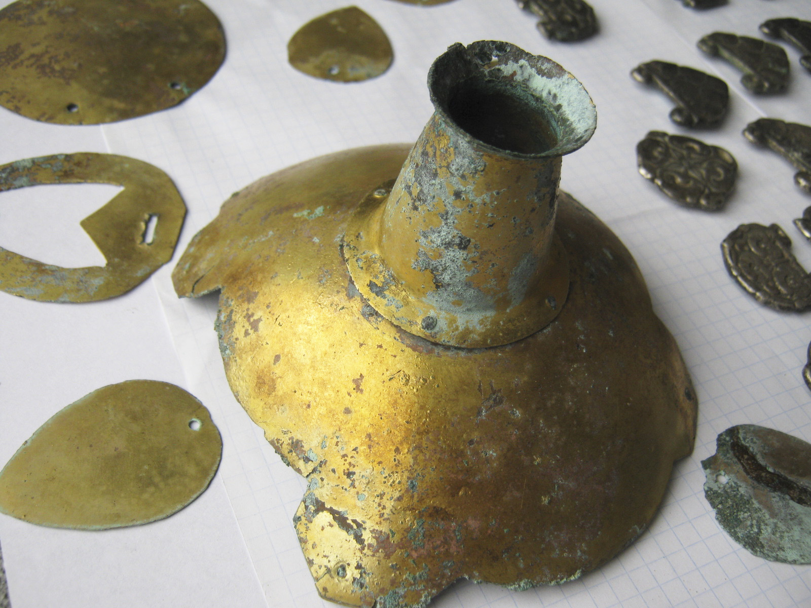 Позолоченный предмет с трубкой является оголовьем коня, часто используется термин «конский начельник». Пряжки, вероятнее всего – сбруйные. Позолоченные листообразные и дискообразные предметы, так называемые «фаллары» – являются деталями украшения коня, и бубенцы тоже скорее всего от него.