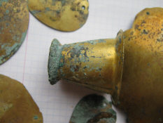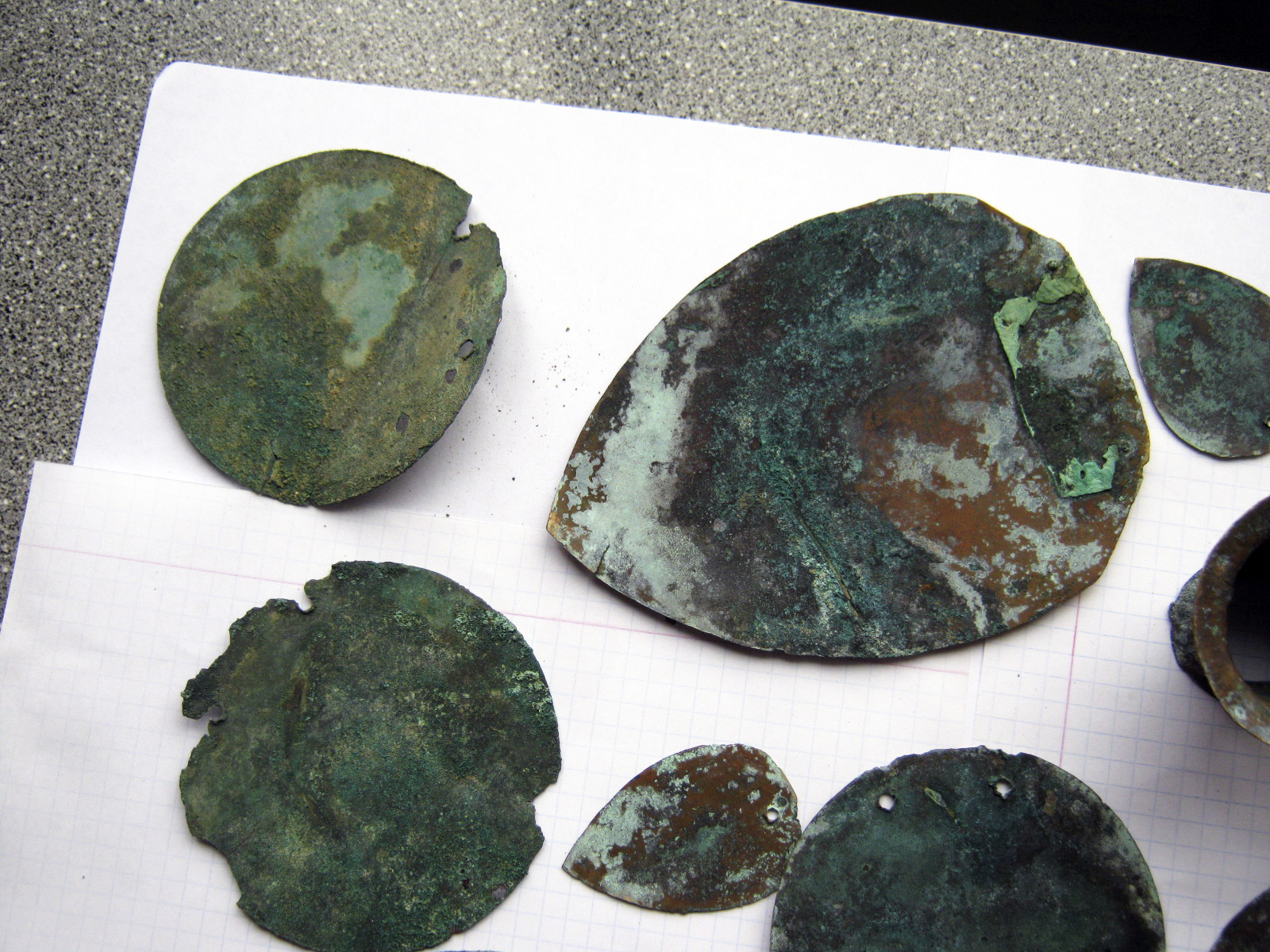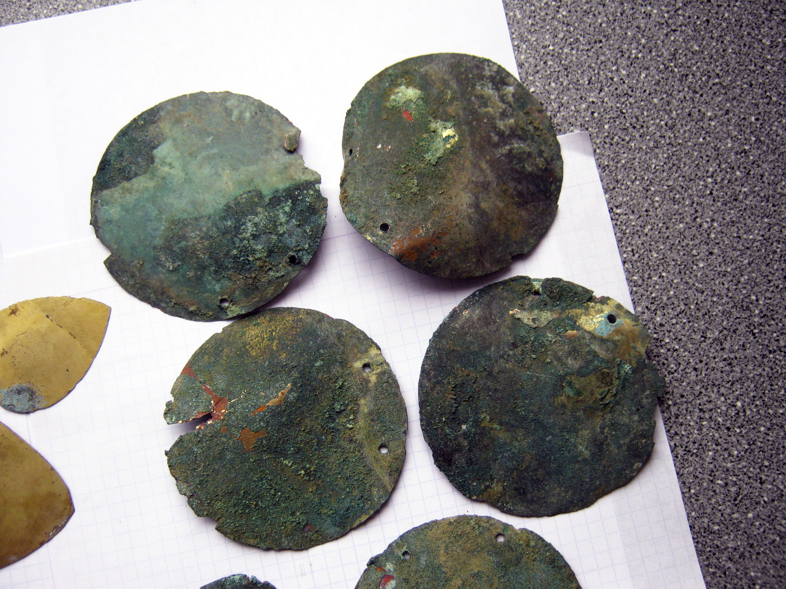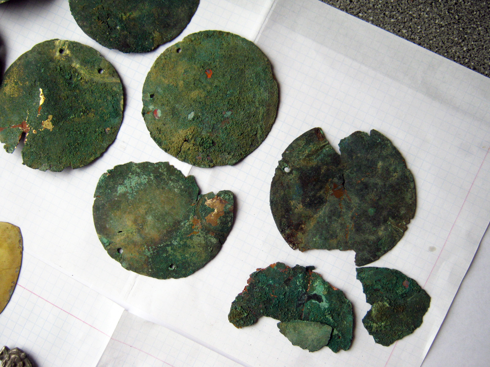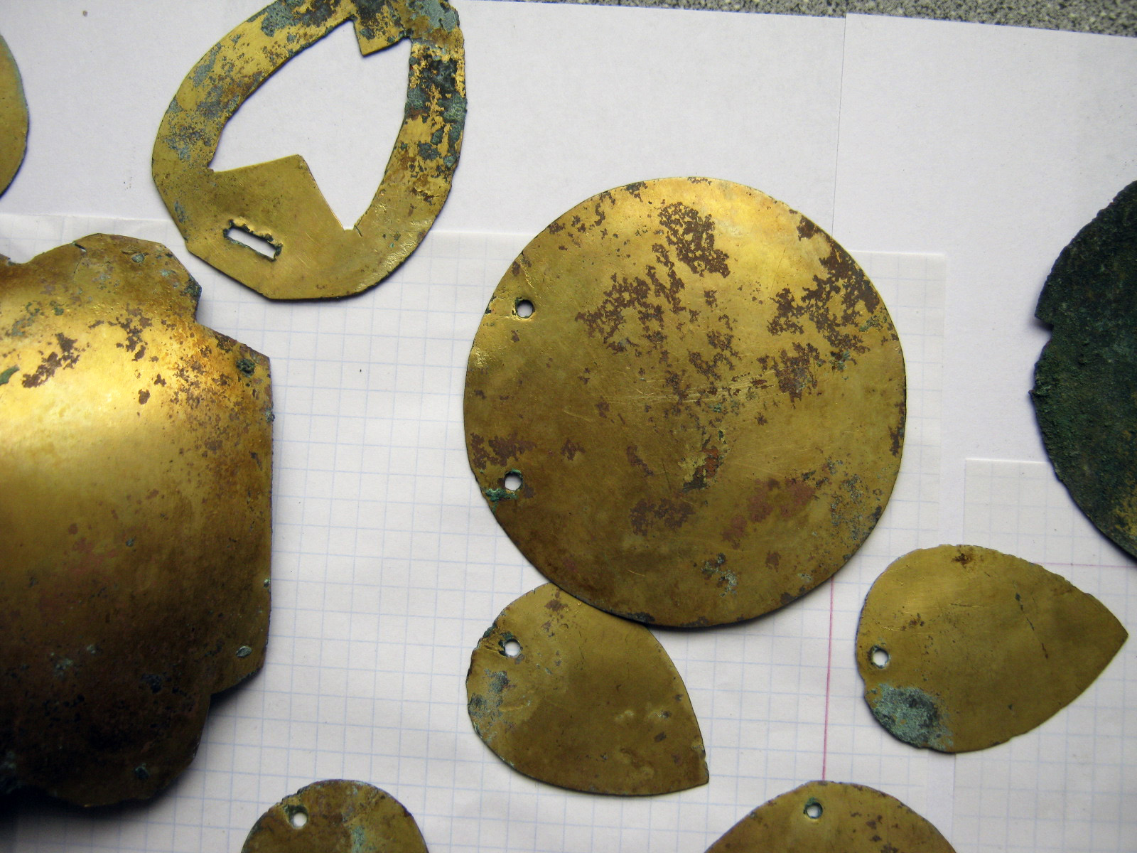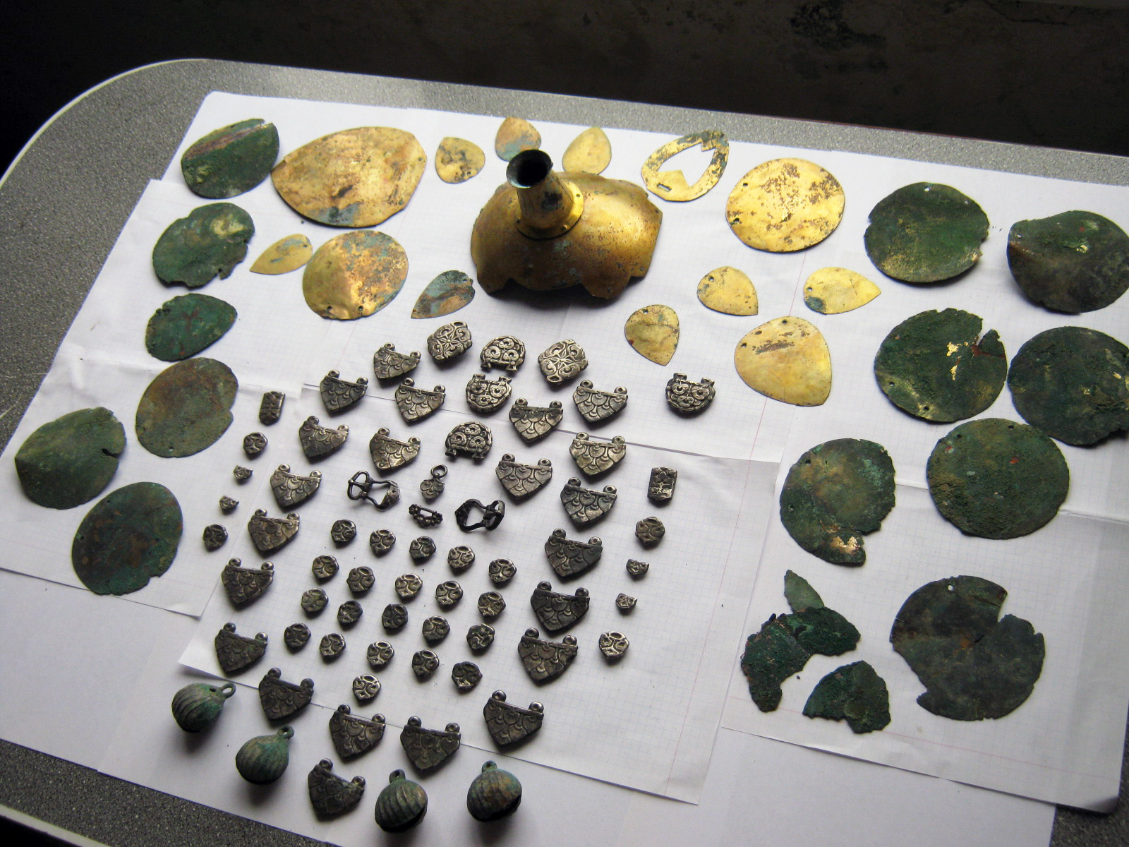 Позолоченный предмет с трубкой является оголовьем коня, часто используется термин «конский начельник». Пряжки, вероятнее всего – сбруйные. Позолоченные листообразные и дискообразные предметы, так называемые «фаллары» – являются деталями украшения коня, и бубенцы тоже скорее всего от него.