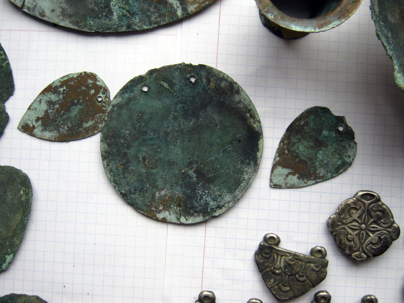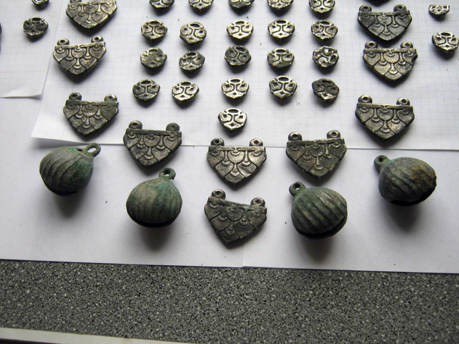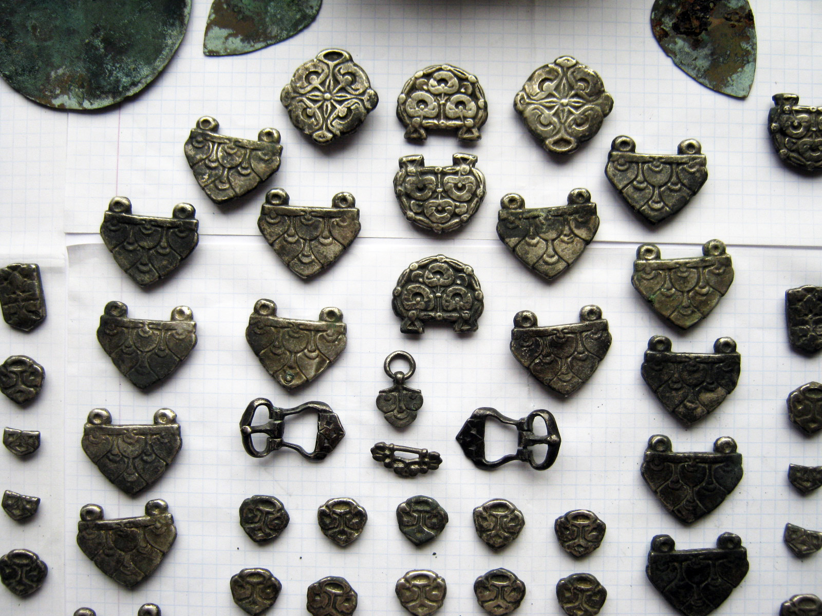 Крупные и мелкие серебряные накладки здесь – украшения пояса. Бляшка со сквозным прямоугольным отверстием и бляшка с подвижным ушком (так называемый «чумбурный блок»), могут быть деталями как поясного набора всадника так и снаряжения коня.