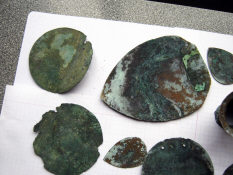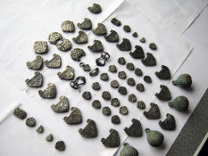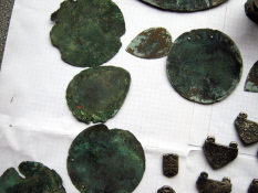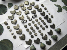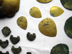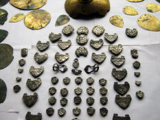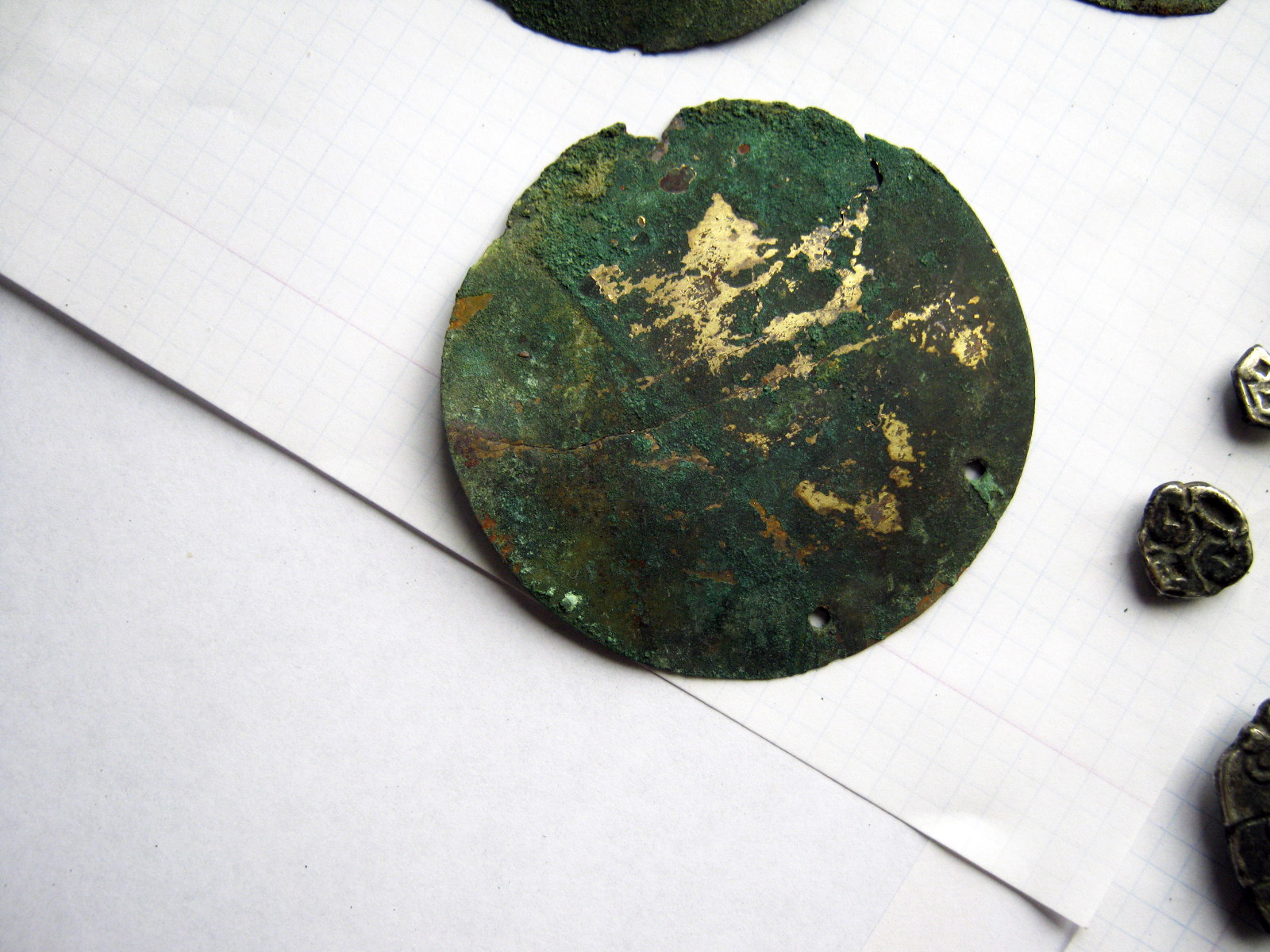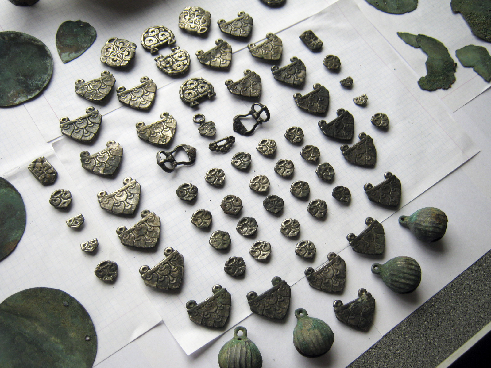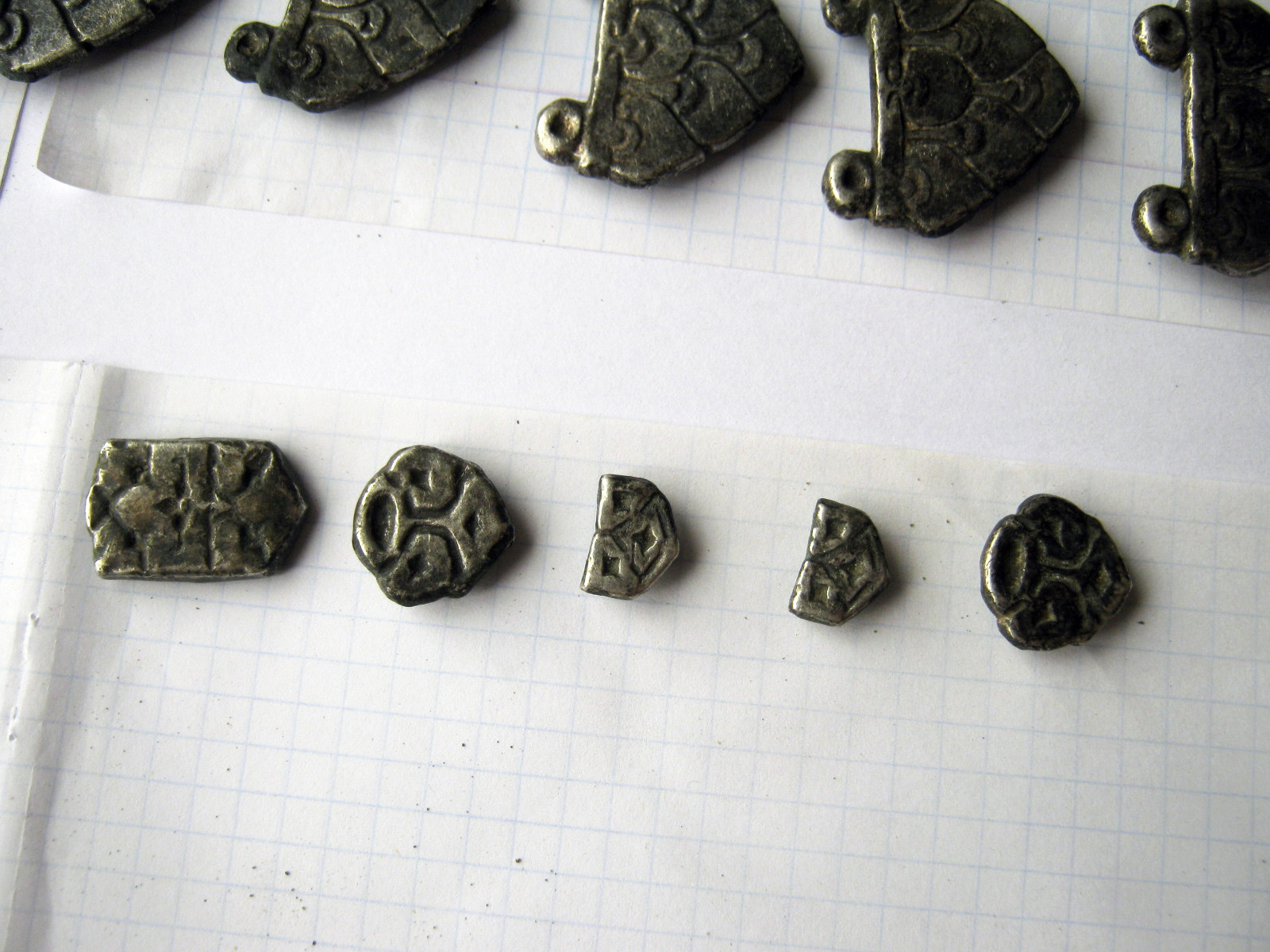Крупные и мелкие серебряные накладки здесь – украшения пояса. Бляшка со сквозным прямоугольным отверстием и бляшка с подвижным ушком (так называемый «чумбурный блок»), могут быть деталями как поясного набора всадника так и снаряжения коня.