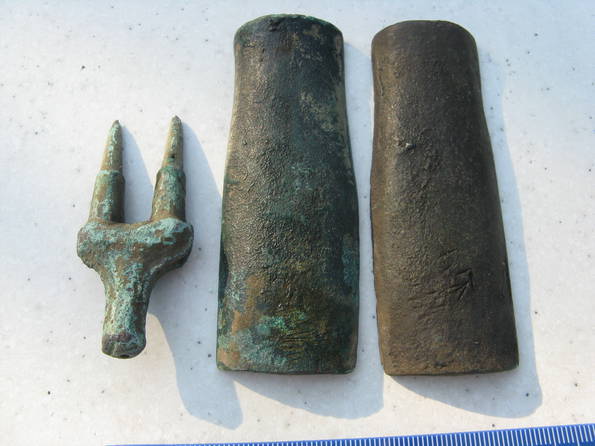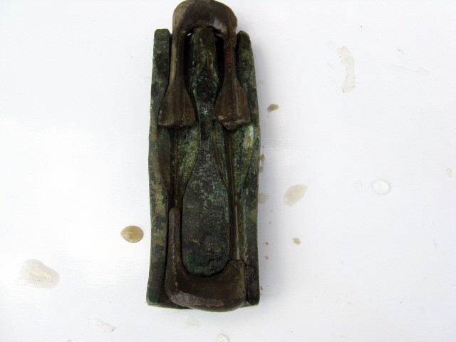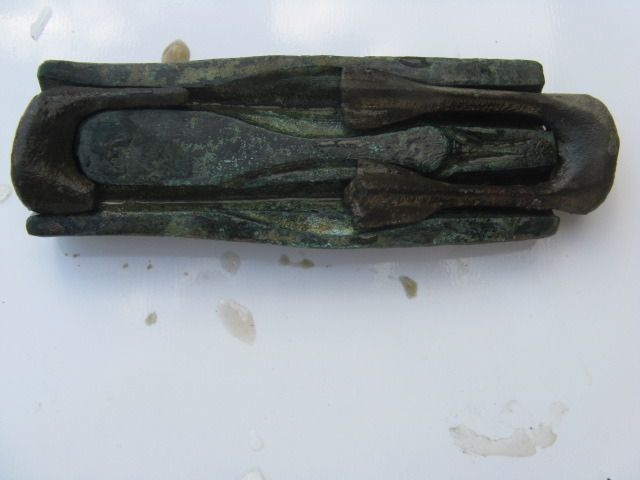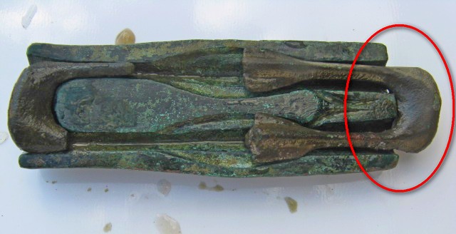 Да всё там с той стороны вставлено(лопасти чётко лежат в форме а литник слева на фото тоже на своём месте) а брак на двухлопастных ранних у меня в находках такой же как и на более поздних. А за год их у меня больше сотни получается с разных поселений и разных времён. Форму при литье в кокиль подогревают, температура подогрева зависит от состава сплава и толщины стенок изделия иначе будет и брак и растрескивание(это про быстрое остывание на втулках).