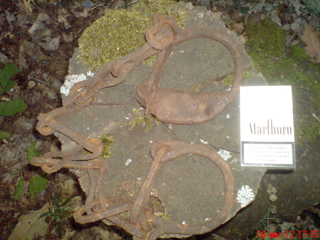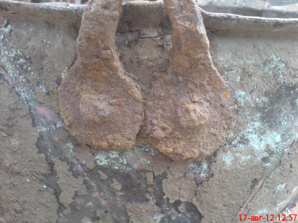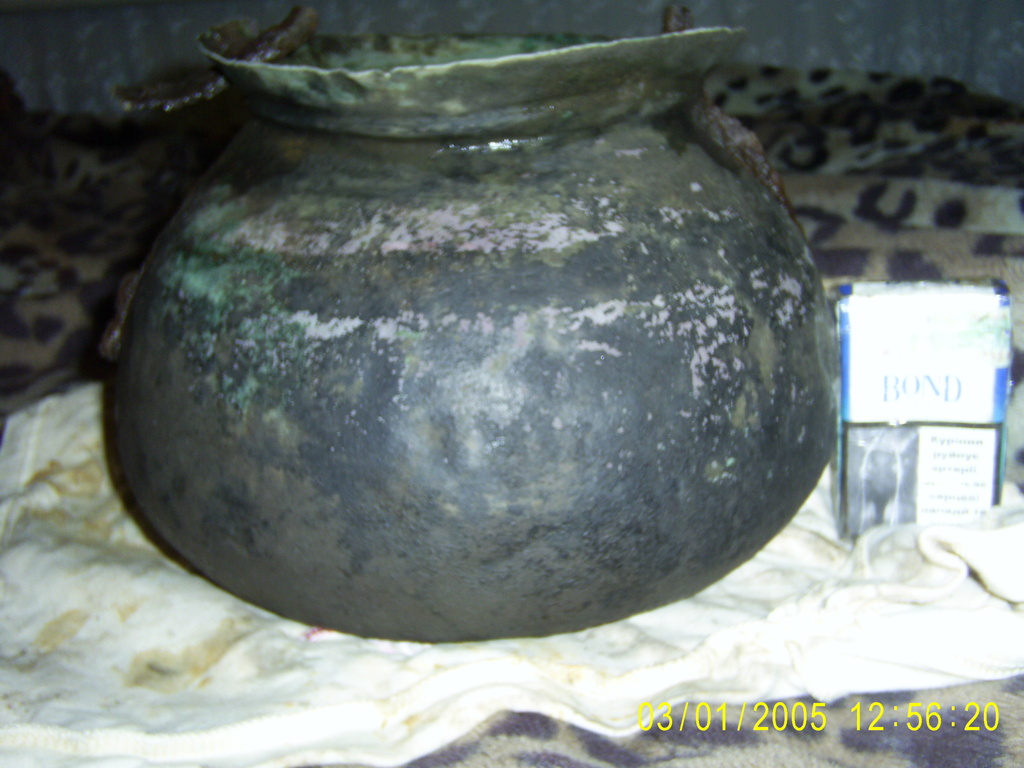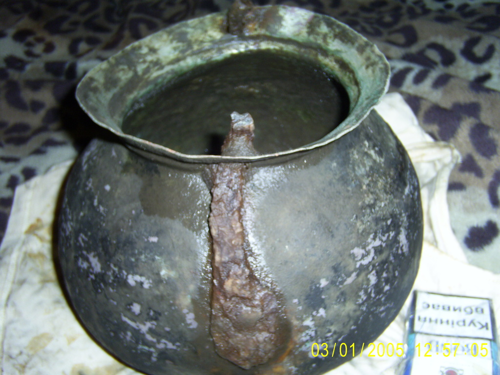 Котел с такой сопуткой, некоторые вещи найдены прямо в нем. Обувная подковка найдена отдельно, и бесспорно, пренадлежит к более познему времени. Дужка у котла, вероятнее всего, хазарская.