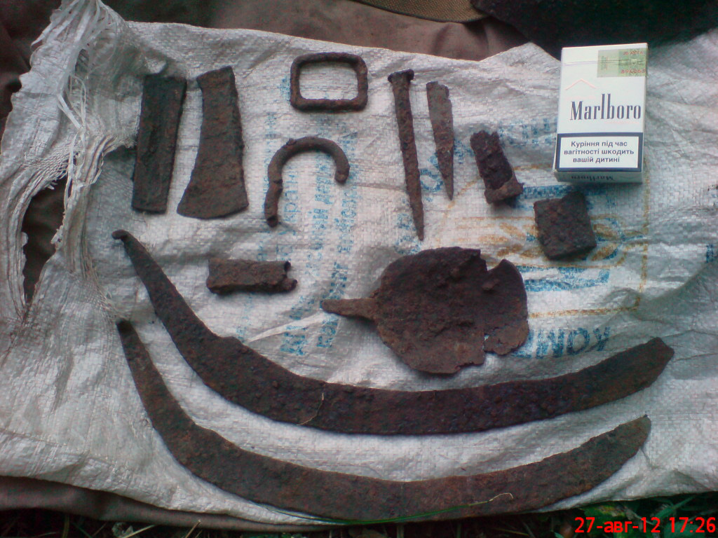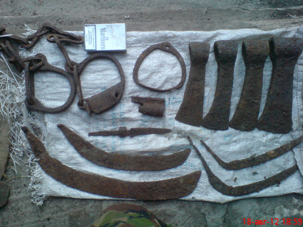 Очень большой интерес представляет восток Украины, а именно половецкая степь, отдельный интерес представляет вопрос наличия там славянских поселений и их взаимоотношений с местными кочевниками. Интересен комплекс найденный искателем dyuk (логин на Reibert, он же Raul на Violity). Большая часть этой публикации посвящена его находкам в одном месте на востоке Луганской области в 2012-2013 годах. Среди находок казан, лейка, топорики (много), детали плуга: наральники и ложкари, дужки от ведер, серпы, стремя, ножи, тесло, подвесной замок и очень редка находка – кандалы, а также наконечников и сабли (одна почти целая) и лоскутка кольчуги, детали снаряжения всадника. Остальное похожие находки, также в Луганской области, привлекают внимание пластины ламеллярного доспеха.