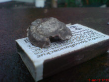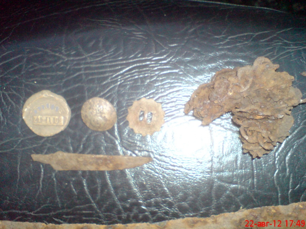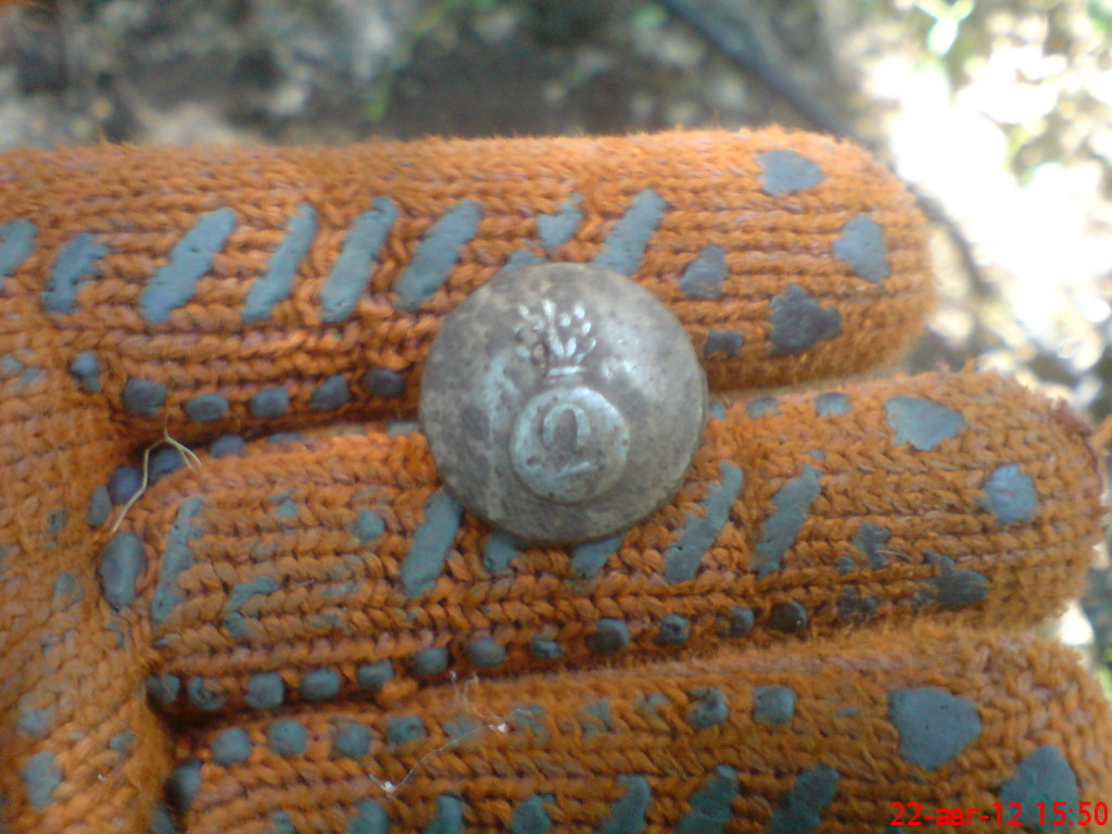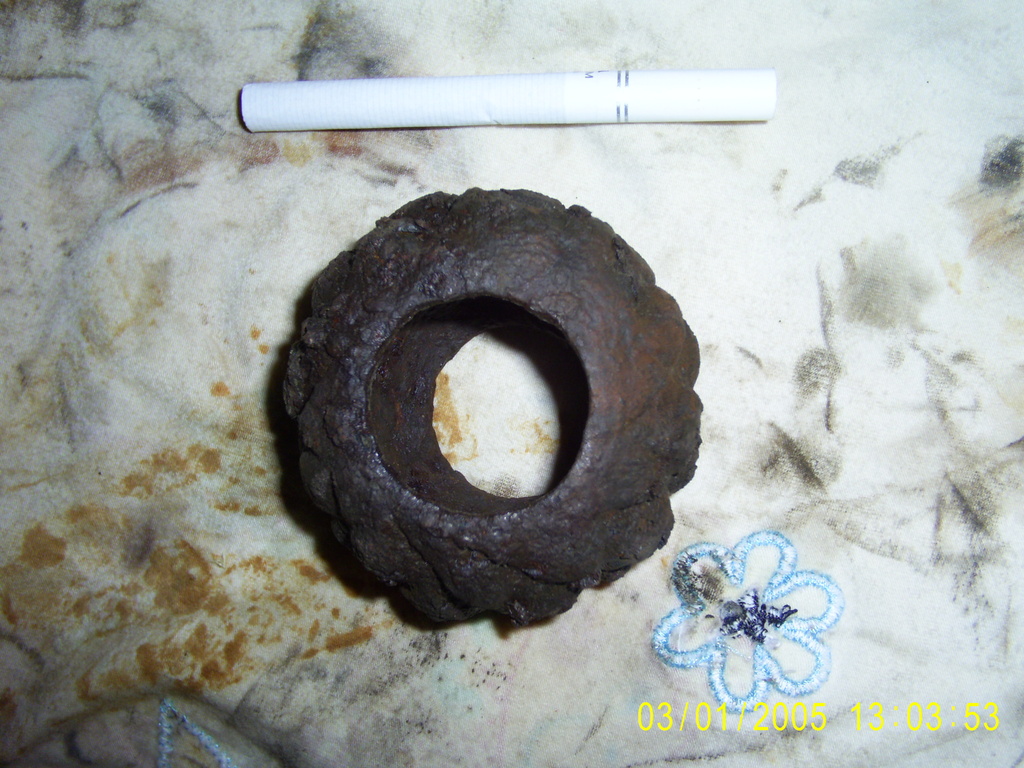 И последняя безделушка.. Сперва подумал,что охотничья пуля,чуть не выкинул,а дома рассмотрел – похоже на брошь в виде цветка.. оболочка медная,покрыта чем-то белым, внутри залит свинец, и имелось два кованых усика из черного металла. второй нашел уже отдельно и в последствии потерял.
