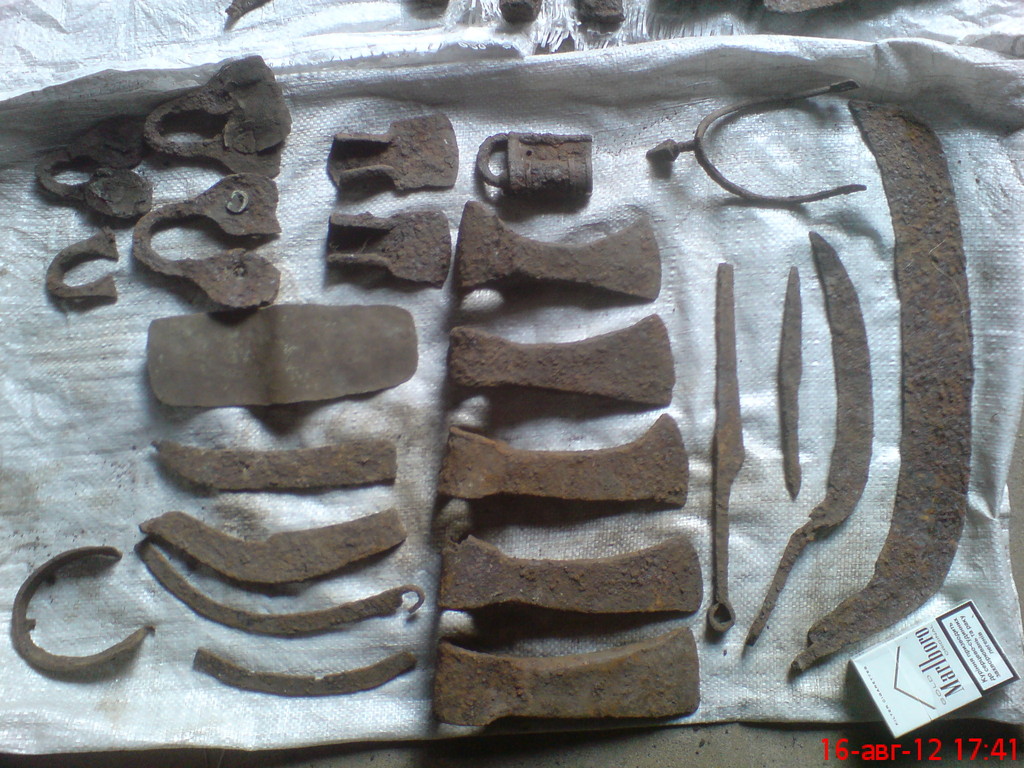 Средневековый медный казан Среневековая железная ложка-лейка Узколезвийный топорик Узколезвийный топорик Средневековый железный держак Детали плугов: широкие подреугольные - наральники, узкие ножеподобные ложкари. Селькохозяйственные орудия труда, шпоры, подкова, держак котла или ведра В центре лейка и топорик и тесло Крепление ушек для дужки Крепление ушек для дужкиДревнерусский топорик Древнеруский дверной замок Шпора с шипом, подвесной замок, ножиКандалы, стремя, топоры, косы и серпы, ножик, наконечник сабельных ножен Ножек с железным кольцом на рукояти Топор тип IV по А Кирпичникову 12-14 век Средневековые кандалы Пуговица периода царизма  металлическая ложечка Осколк топоров, гвозди ложка, детали сабельных ножен Медальон и пуговица периода конца царизма и сгусток кольчуги