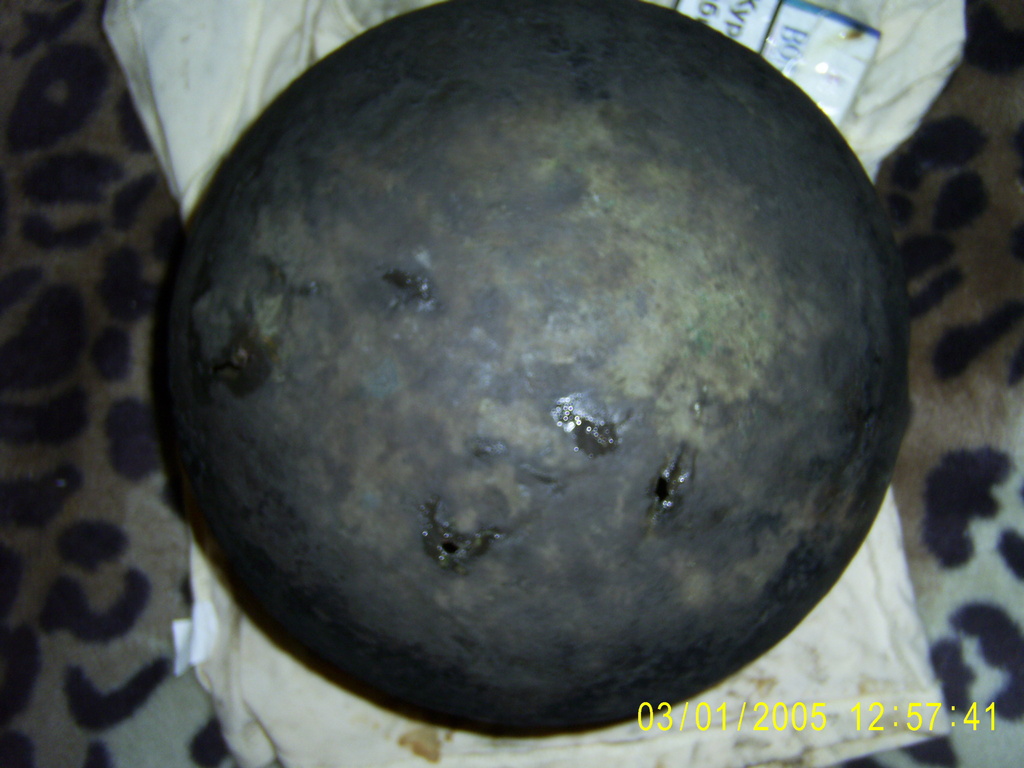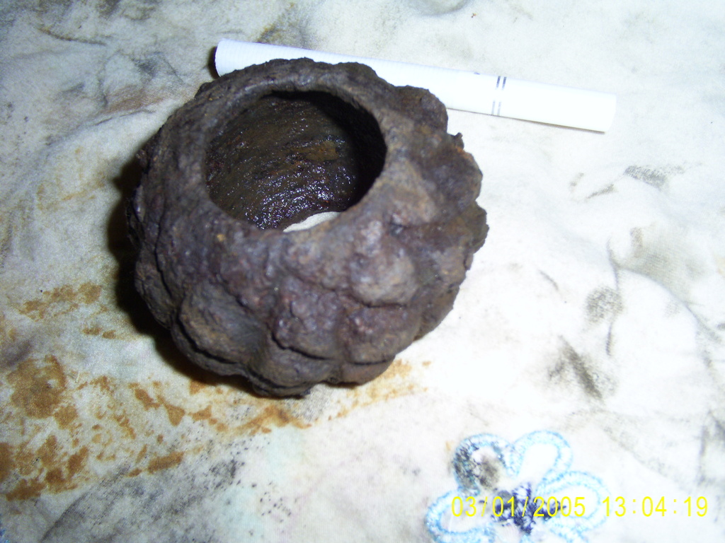 Булава хазарского стиля и котелок. Материал котла – медь. Горловина внутри покрыта чем-то белым, предположительно олово.