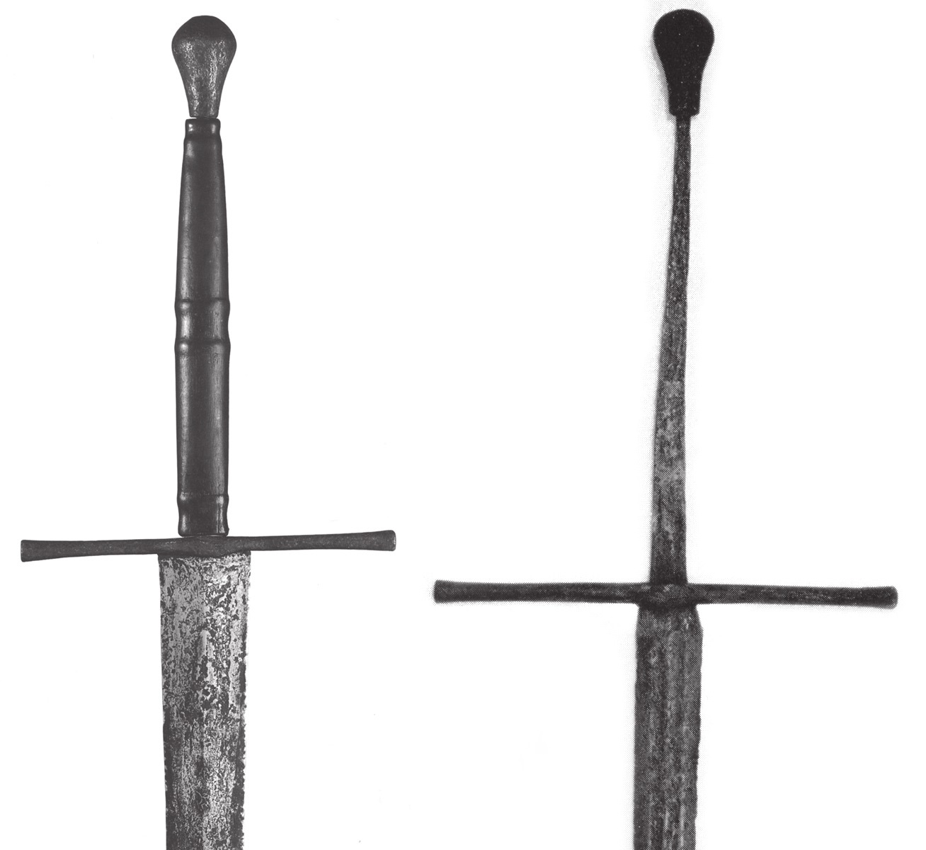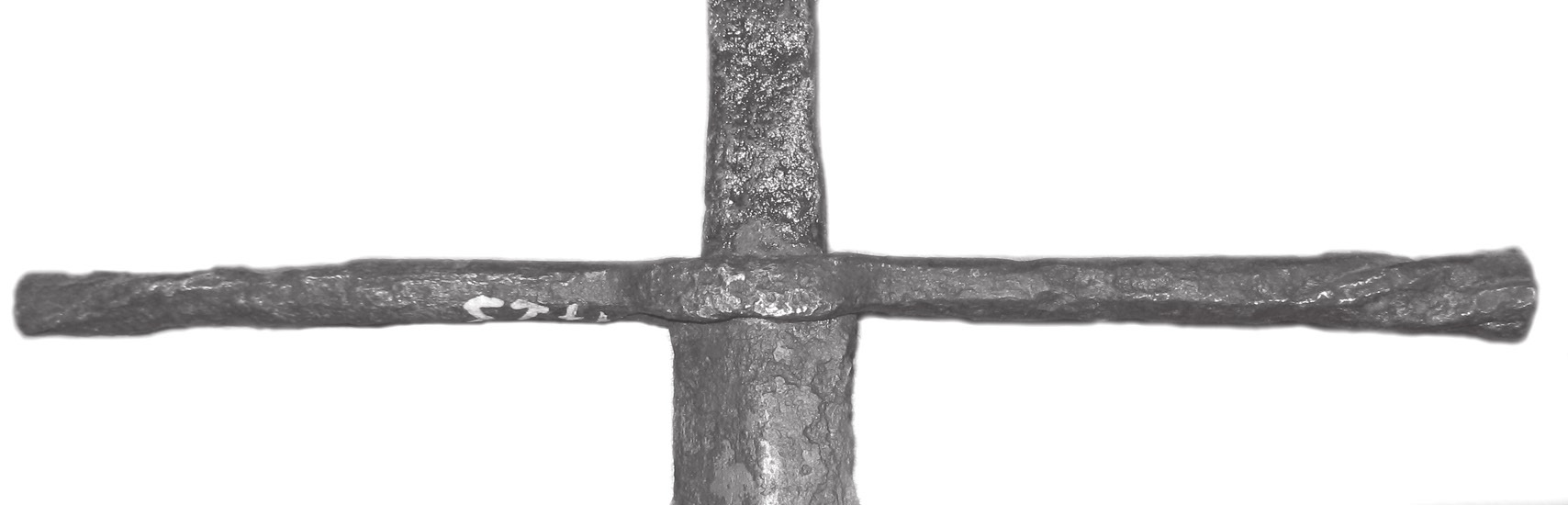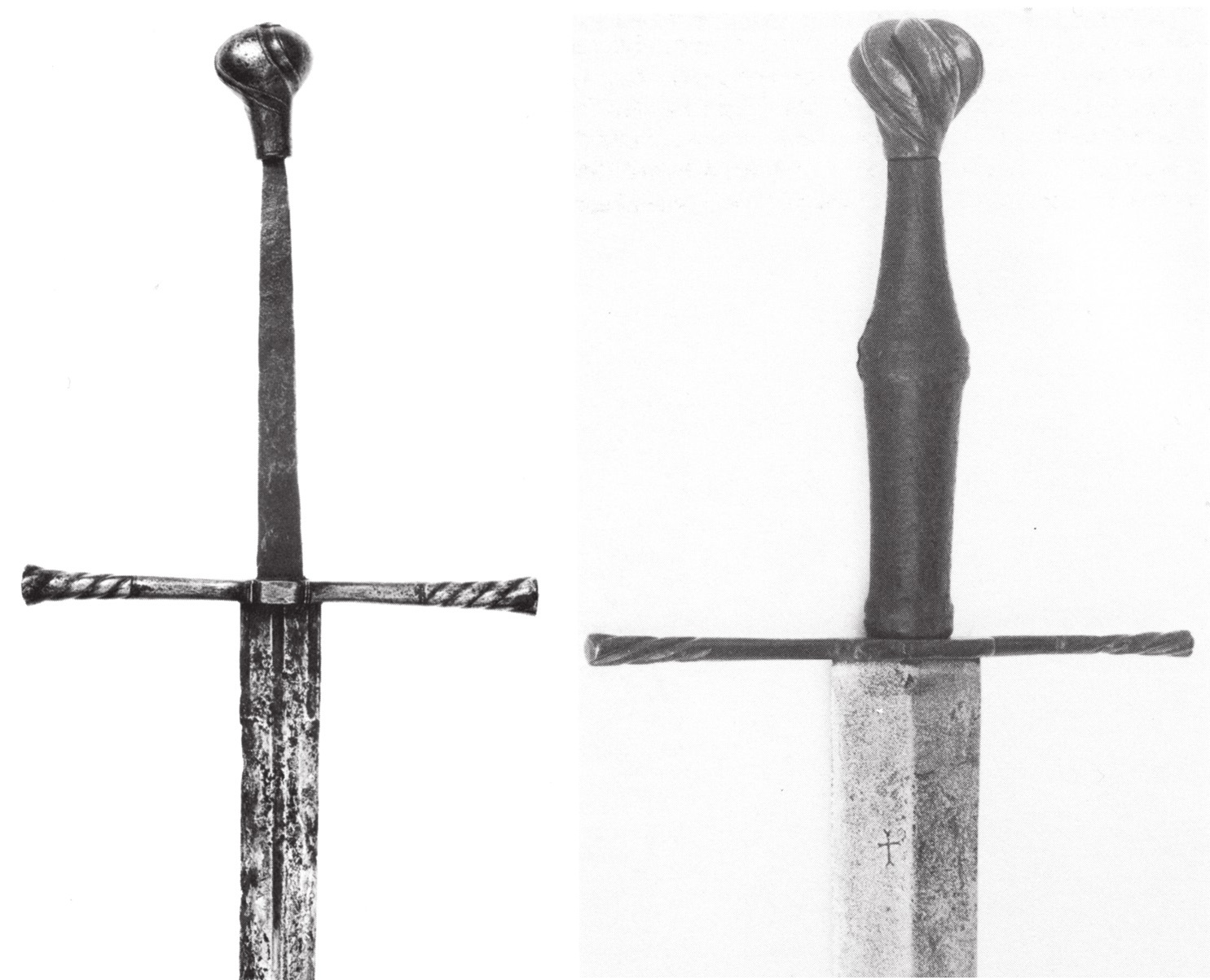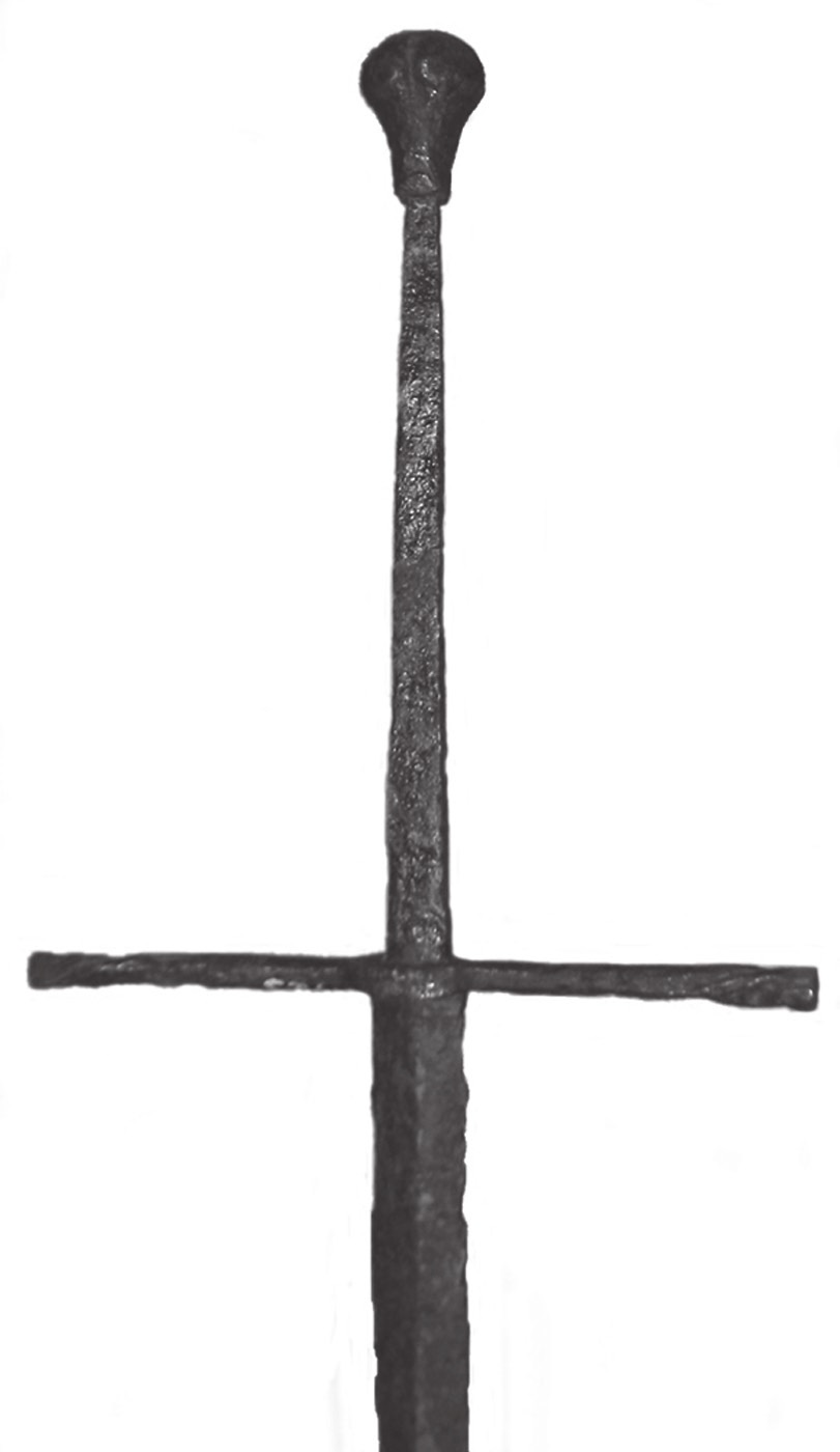 Поэтому дополнительными маркерами временных рамок здесь могут послужить элементы эфеса -крестовина и навершие. По отдельности оба элемента эфеса датируются тоже достаточно широко. Так, подобная форма крестовины появилась в XIII в. и просуществовала до начала XVI в. А грушевидные навершия встречаются на мечах с начала XV столетия (Oakeshott, 1964, p. 106). То есть это также не позволяет нам сузить датировку рассматриваемого меча.