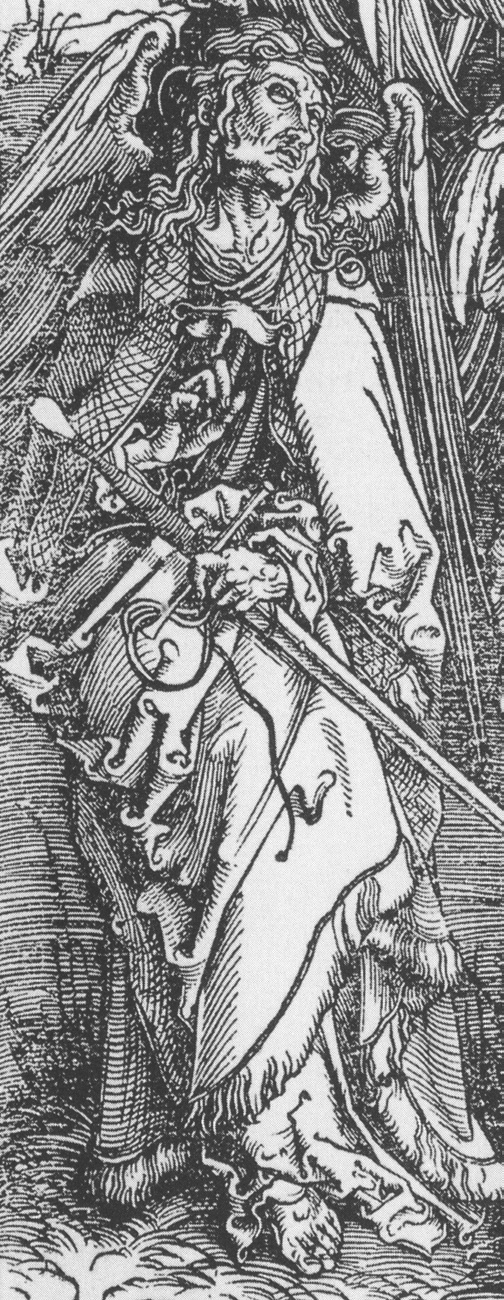 Анализ такой группы, как изобразительные источники, тоже дал нам информацию по мечам с подобной комбинацией навершия и крестовины. Её мы можем видеть в немецкой и чешской станковой живописи рубежа XV-XVI вв.: «Святые Екатерина и Барбара», Л. Кранах Старший, около 1516 г. (www. bildindex. de/ MI09827e09a); «Святой Георгий поражает дракона», неизвестный чешский мастер, около 1497 г. (Pesina, 1950, s. 51); на гравюре «Четыре ангела удерживают ветра» А. Дюрера, 1498 г. (Muller, 2002, S. 154, Abb. 155) (рис. 3); на швейцарской миниатюре «Возвращение из похода» Бернской хроники Д. Шиллинга, 1485 г. (Bosson, 1982, S. 47, III. 1). Как видим, все приведенные источники относятся к концу XV -началу XVI вв., тем самым подтверждая временные рамки вещественных источников. Еще, на наш взгляд, здесь важно отметить то, что изображения происходят из Германии и соседних с ней территорий. Таким образом, сопоставляя приведенный вещественный материал с изобразительным, мы можем предположить, что отмеченная комбинация эфеса у мечей характерна для Германии и тех регионов, где в комплексах наступательного вооружения присутствовало немецкое влияние.